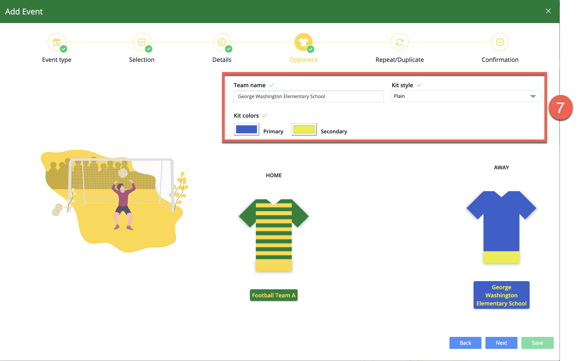 7. Enter the opponent team's name and select a kit style and colors for them, and click Next