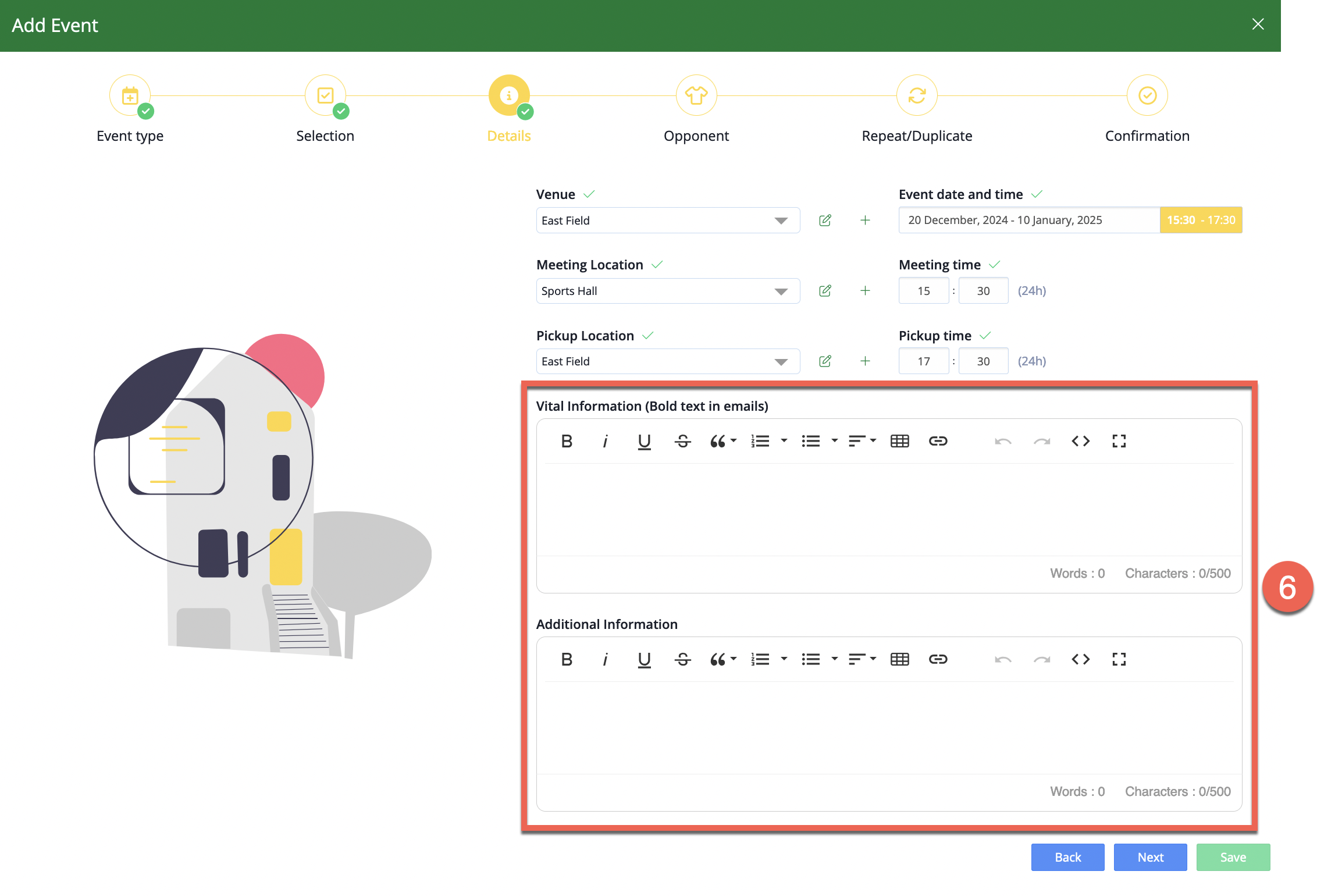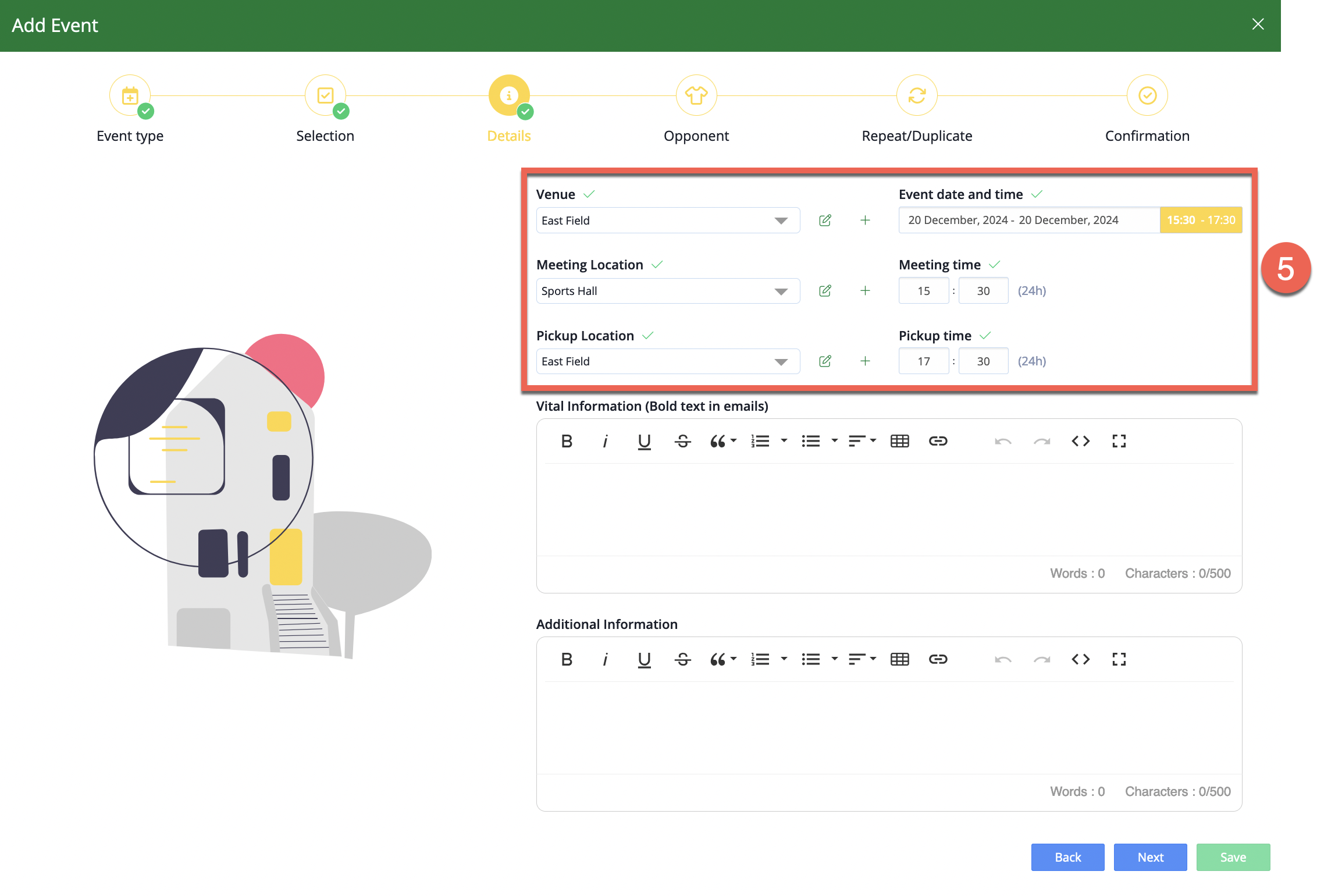 6. Fill in the Vital Information and Additional Information for the event, and click Next