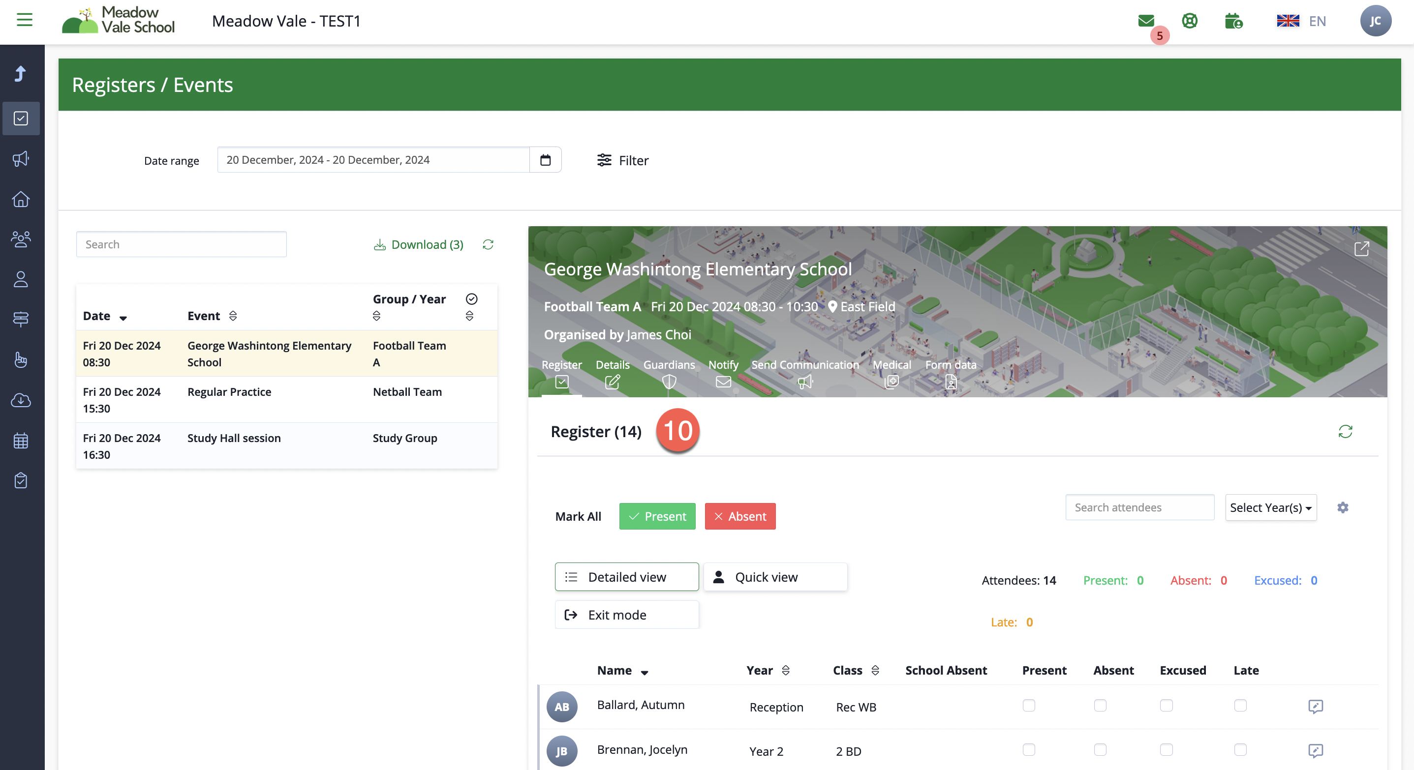 10. You can view the events created on the specified dates and the students listed in the registers in your diary or under Reception > Registers shortly.