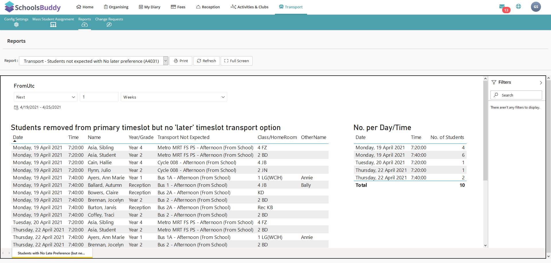 Transport - Students not expected with No later preference (403.1) - Shows students that don't have a late preference transport option but need one