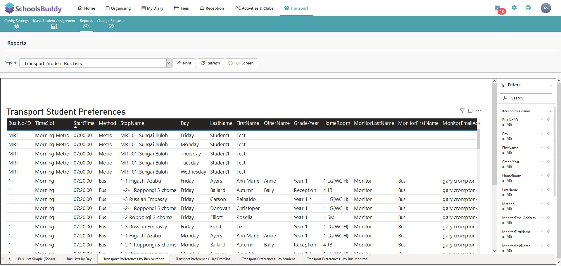 Shows the student transport preferences for each day of the week with Bus Monitor details.