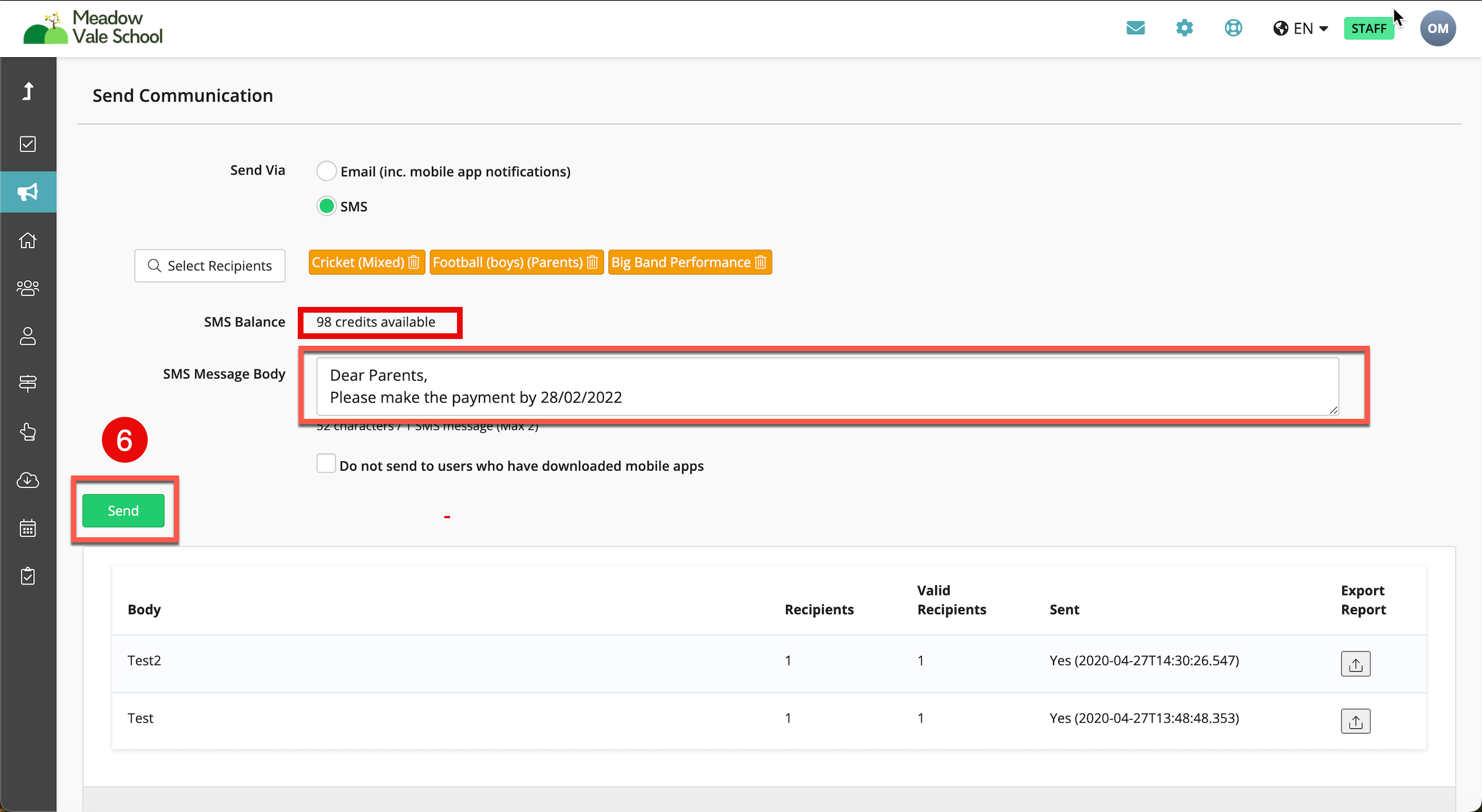 - SMS Balance: this shows how many SMS credits your Schools has available (credits can be purchased through the SchoolsBuddy Sales Team)