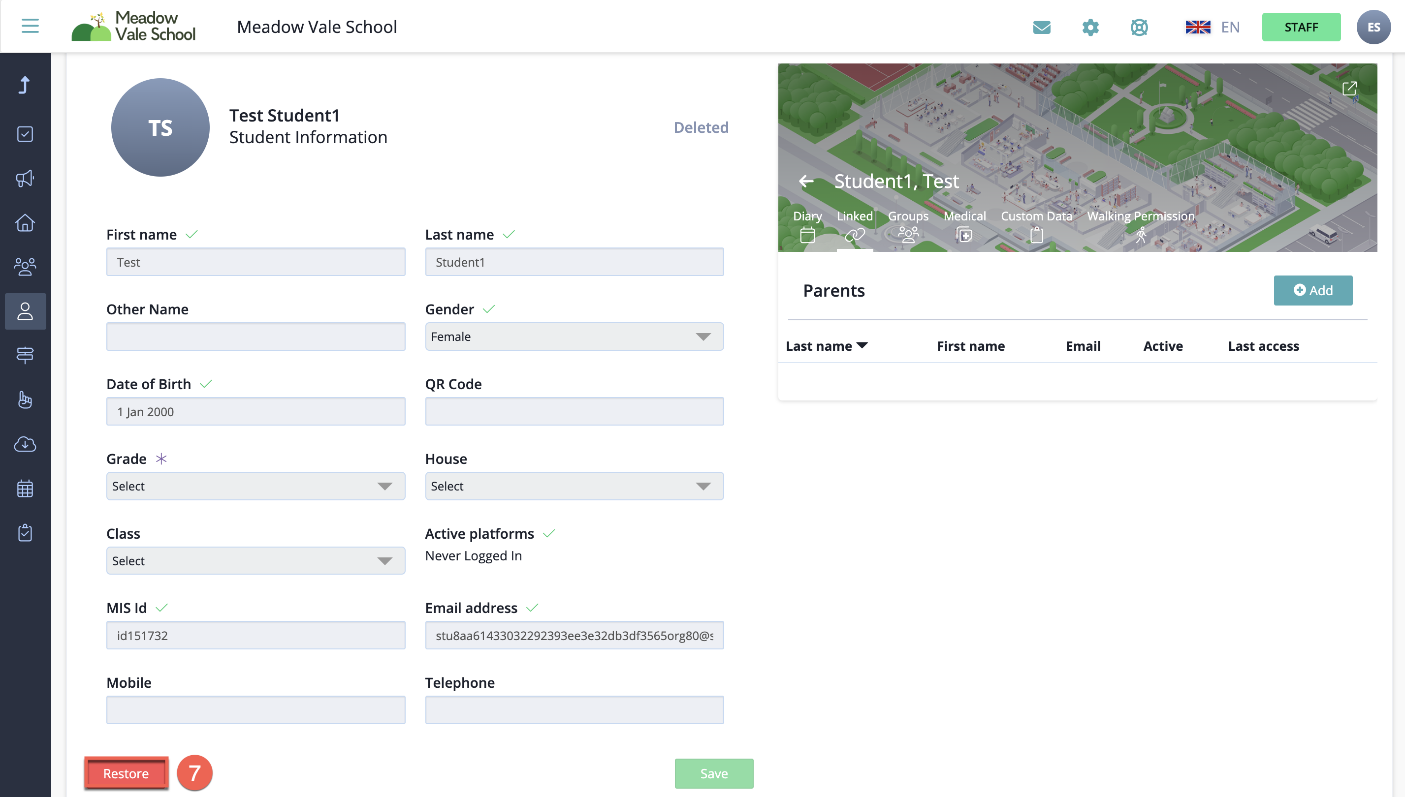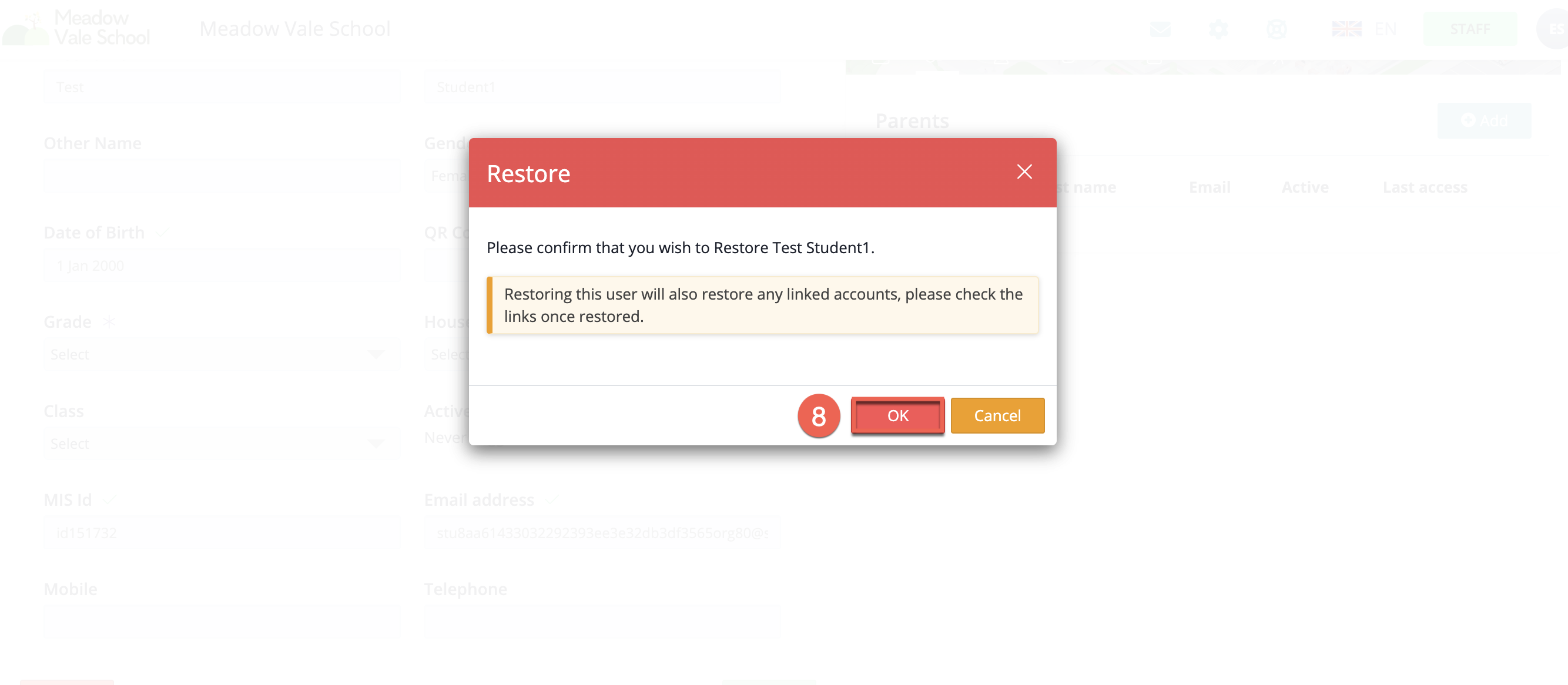 - Click 'Restore' on the pop up. This will restore any linked accounts with this student and any groups they were members of.