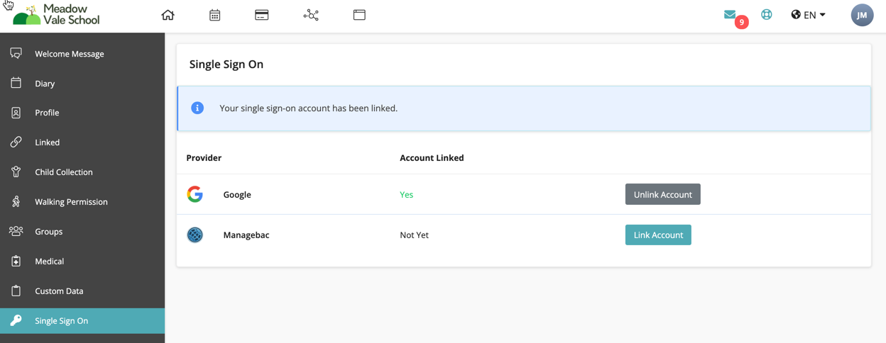 If your school would like their parents, students or staff to use single sign-on with an email address that is different from the email address stored in your MIS there is an option for users to link their accounts themselves in the profile section.