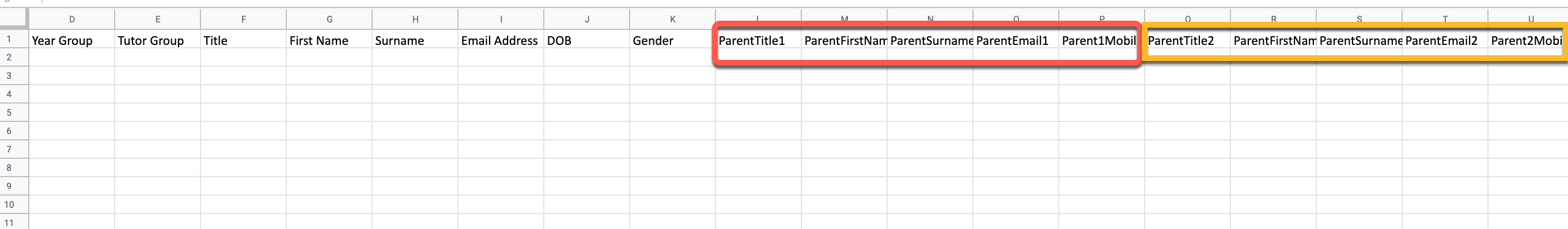 - Please add in the parent/guardians' information next to the student; There is space for two contacts; 'Parent 1'(Red) and 'Parent 2' (Yellow).