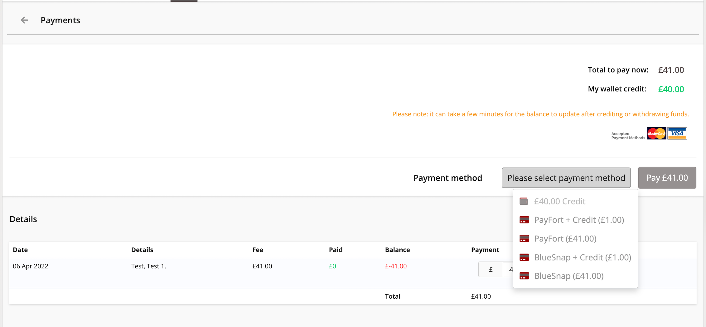 To pay using credit in your wallet select ' XX Credit'. The button beneath will change from the payment provider to say 'Pay xx amount With Credit Balance'. Click the button to confirm.