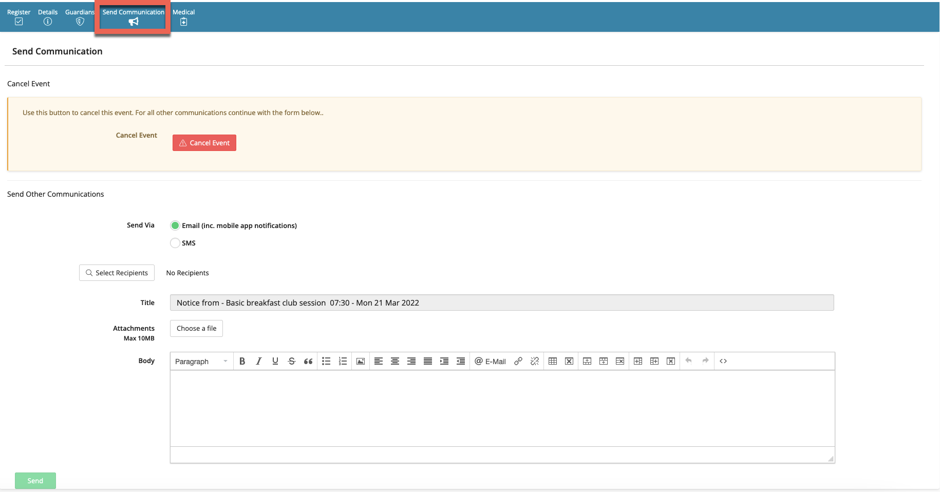 - Send Communication can be used to send messages when canceling the event, or send a message to the group via email or SMS.