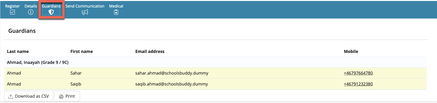 - Guardians contains parent/ guardians contact details for quick access, including quick link phone numbers.