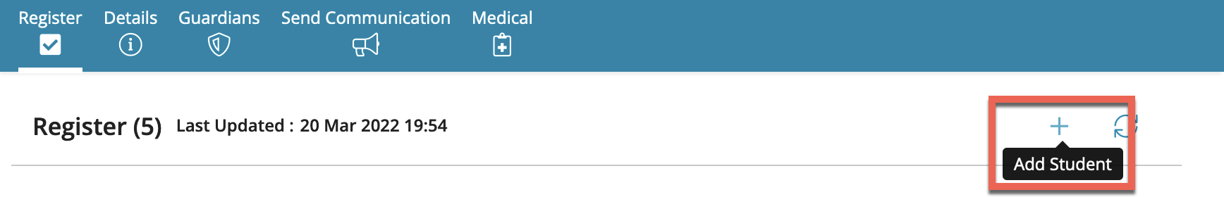 - Some schools may give admin users access to see the Add button. This is used to add students to the register without raising any charges.