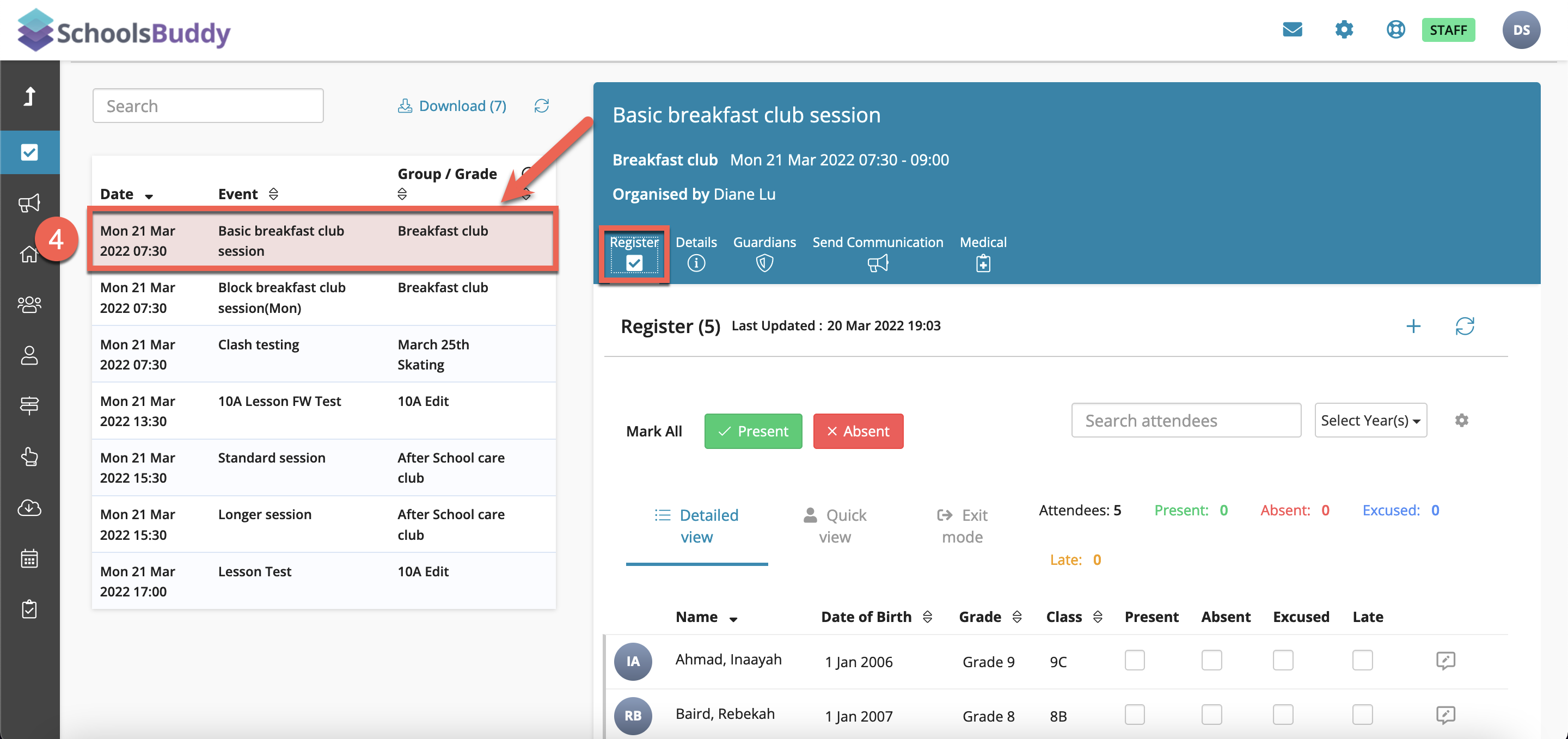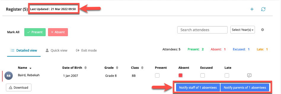Conflict state(s) of attendees when more than one staff member are taking registers/ Live time stamp of the latest register/ Notify staff & Notify parent of absentees