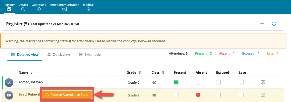 - The register saves in real time so that more than one staff member can take the register at the same time. For example, if there is a particularly large group, when two staff members are take the registers simultaneously, if one staff member marks a student with a conflicting status, a Resolve Attendance State button appears, the staff may click on the button to confirm or cancel the changes.