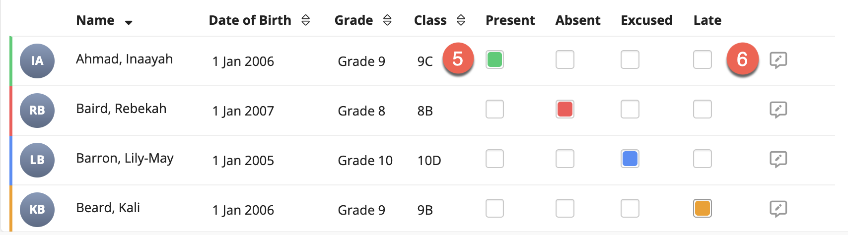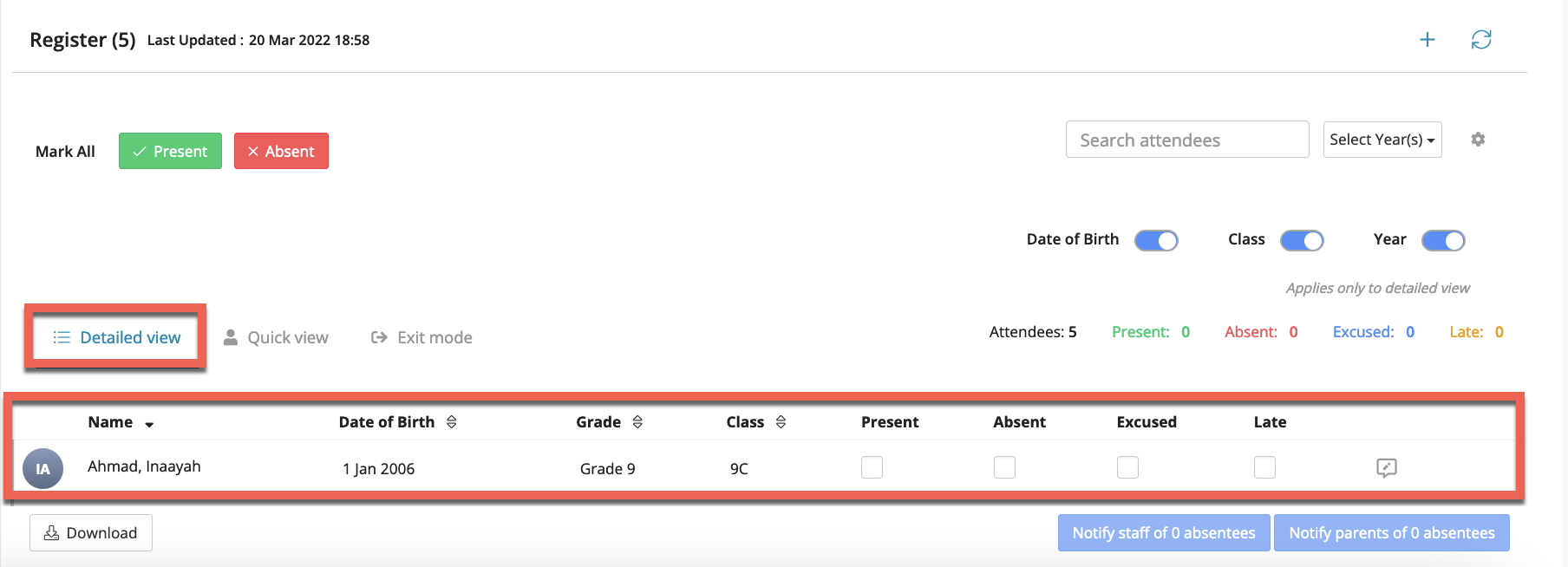 - Detailed view: defaulted to show the students Year and Class, you may also choose to view the Date of Birth by switching on the Date of Birth.