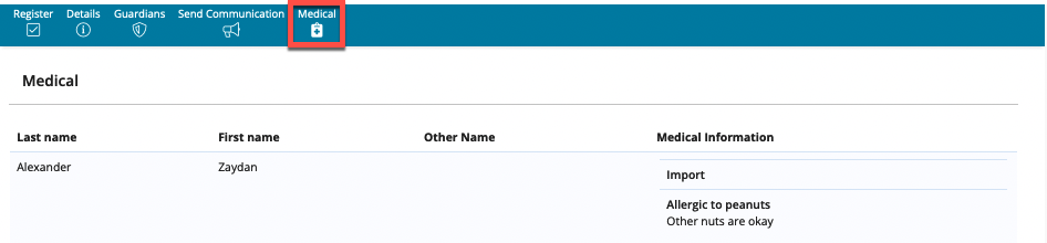- Medical gives quick access to medical details (collected by a custom data form or from your MIS. Please contact SchoolsBuddy for more details). If you are not using an MIS system, admin users can manually update them on the student's account.
