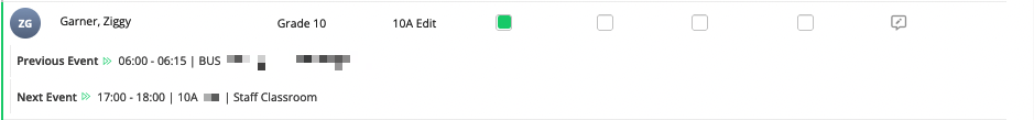 - Previous/ Next Events: If a student is attending other events before or after the current event, they will show under the student's name.