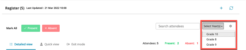 - Select Year: If you have different year groups in the same register but only want to see Grade 10, you can tick on the year group(s) required.