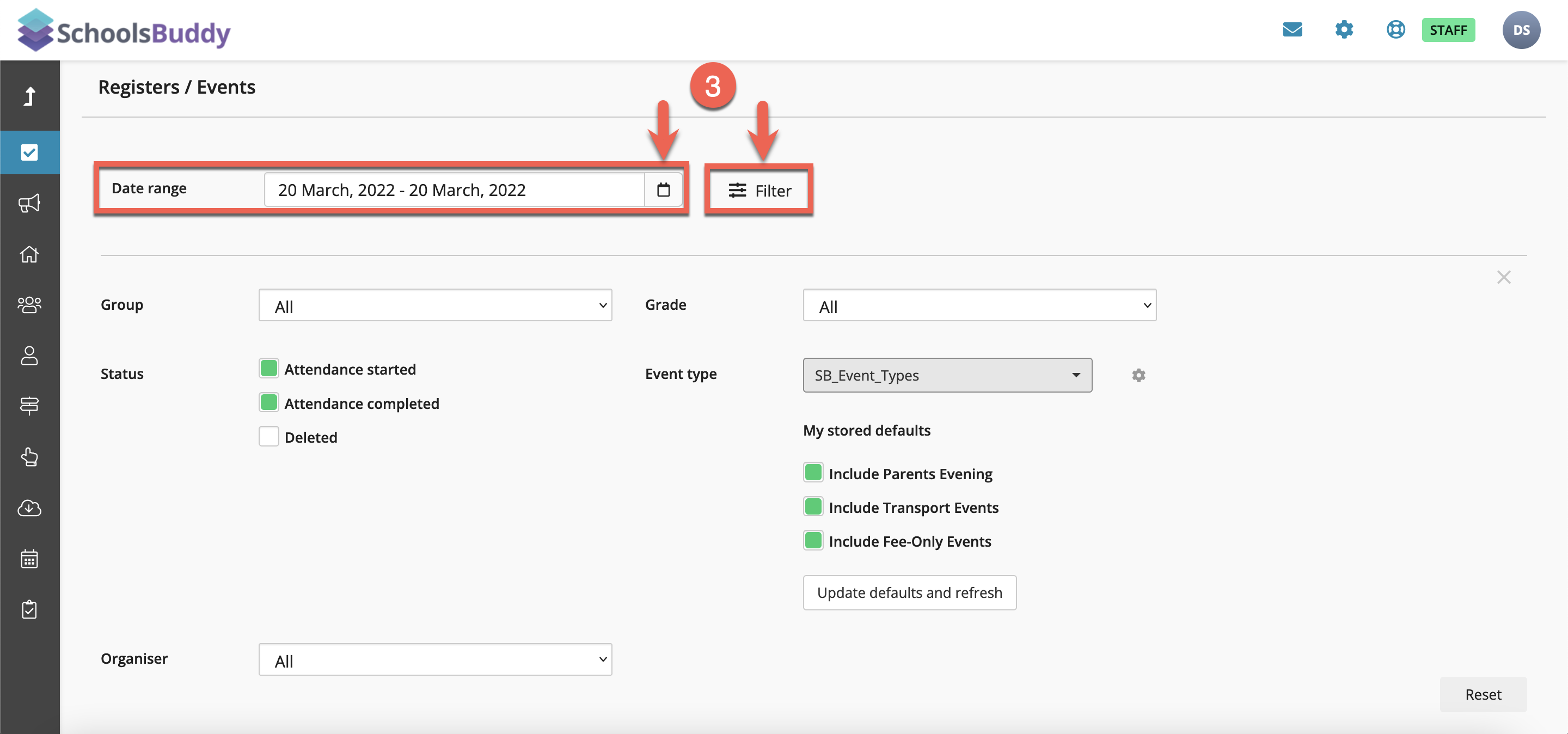 - The date range will default as today's registers. You may change the date range by clicking on the calendar icon or change the group, year, event type and organiser by clicking on Filter. There are filters to see attendance started, completed or deleted, also filters to remove parent's evening appointments, transport registers, or fee only events from the view.