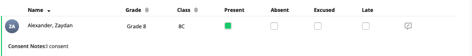 - Consent Notes: If a parent has written any extra consent notes at the time of accepting an invite, they will show under the student's name.