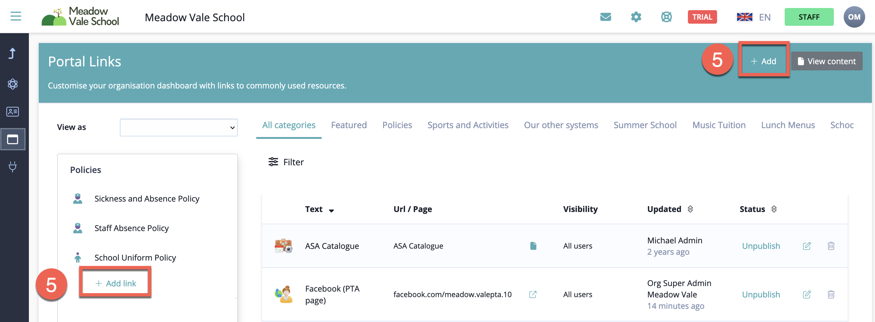 - Click Add Link under the Category you have made, or click the Add button at the top of the page to add some content.