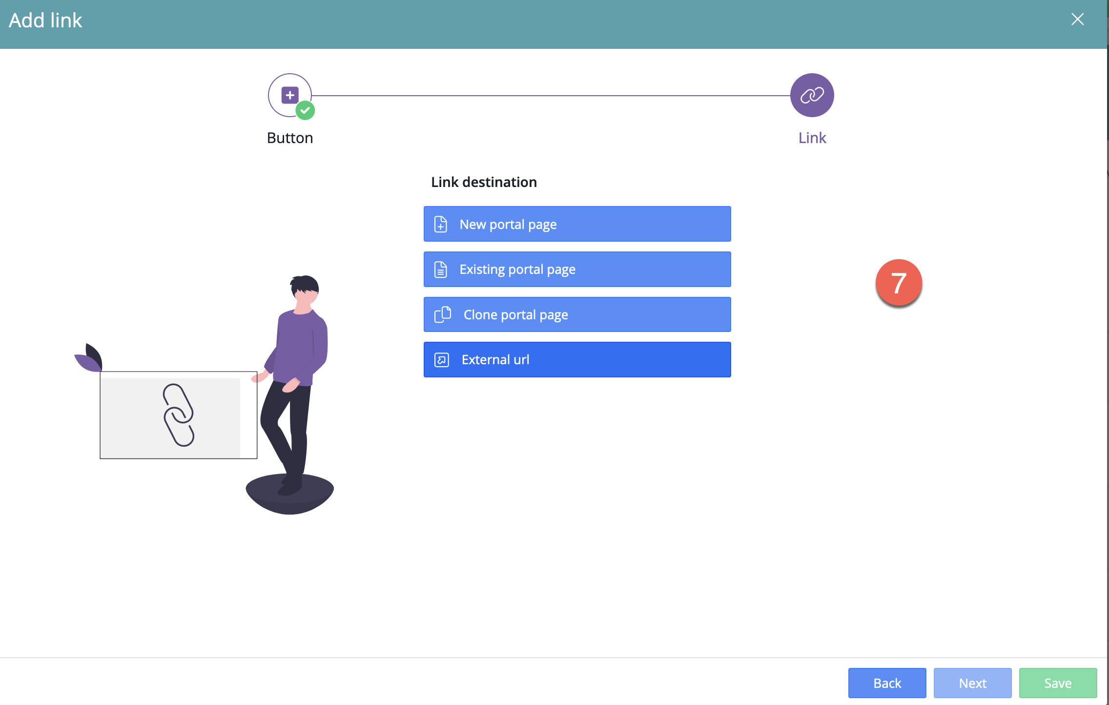 If you choose an external link, you can enter it directly on this page and Save. If you choose a new portal page click Next to continue creating your page.