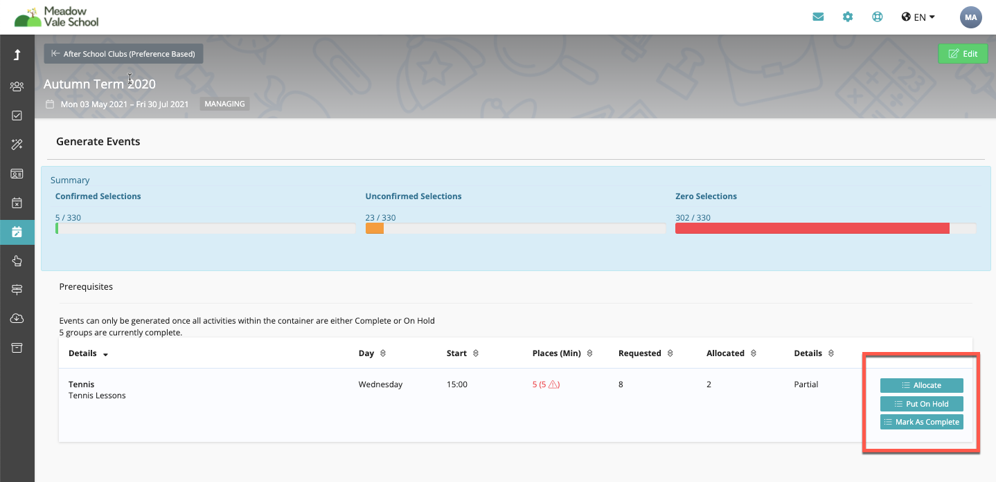 Use this option if you want to create all future events for this group and run the activity with the allocated students. Once marked as complete and even with no students the events will be generated for this group/activity and this will be live ready for either join requests or manual additions to the group.