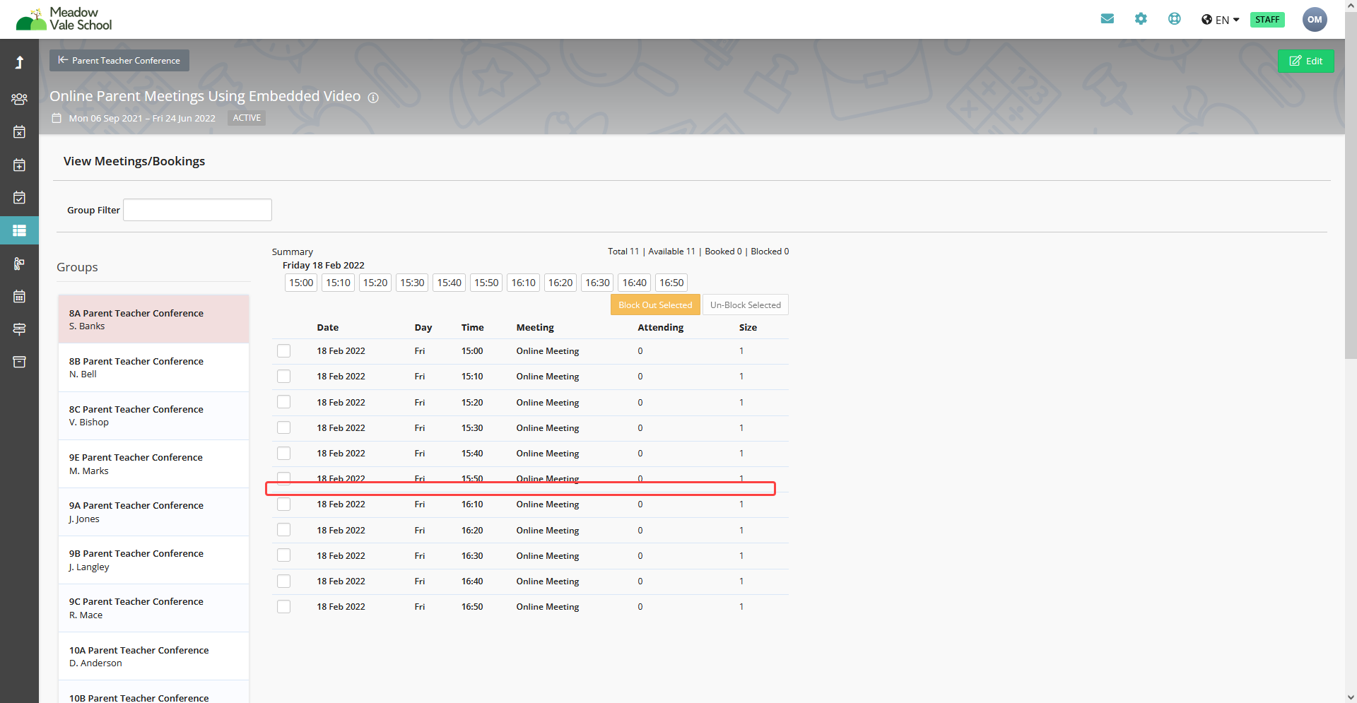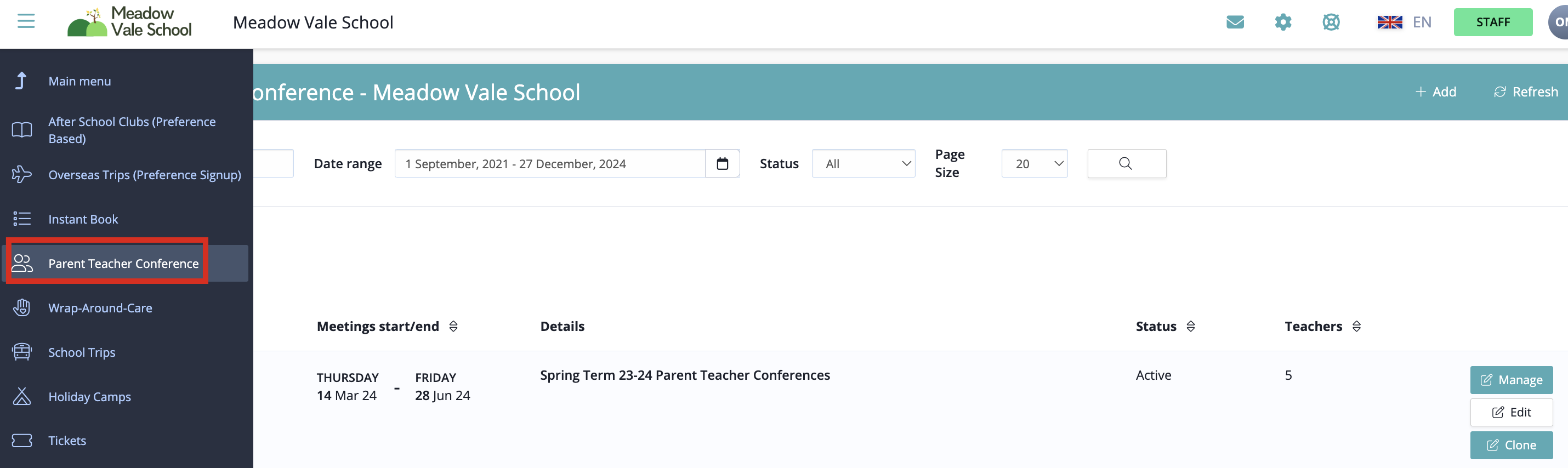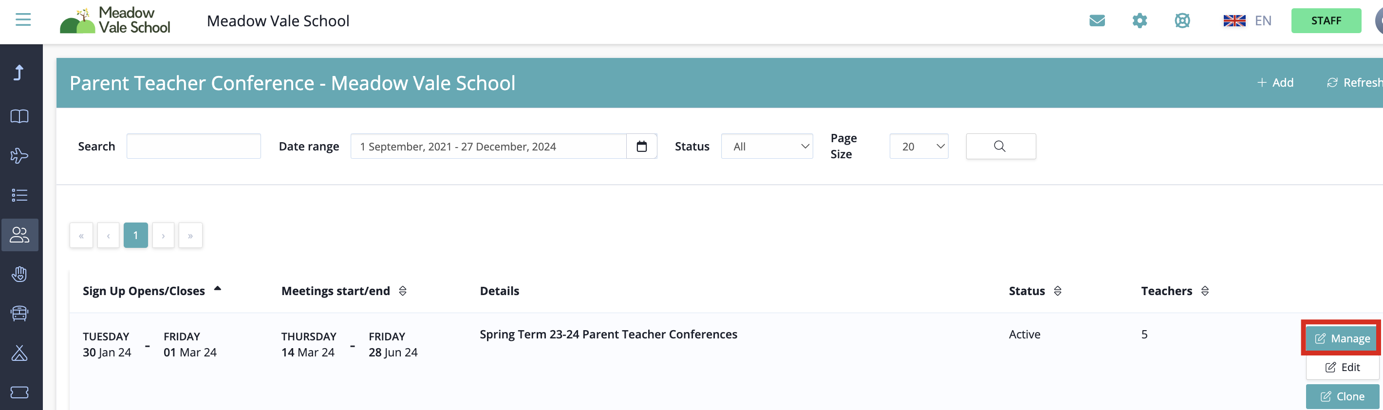 - Click 'Manage' for the Parent Teacher Conference for which you wish to delete events.