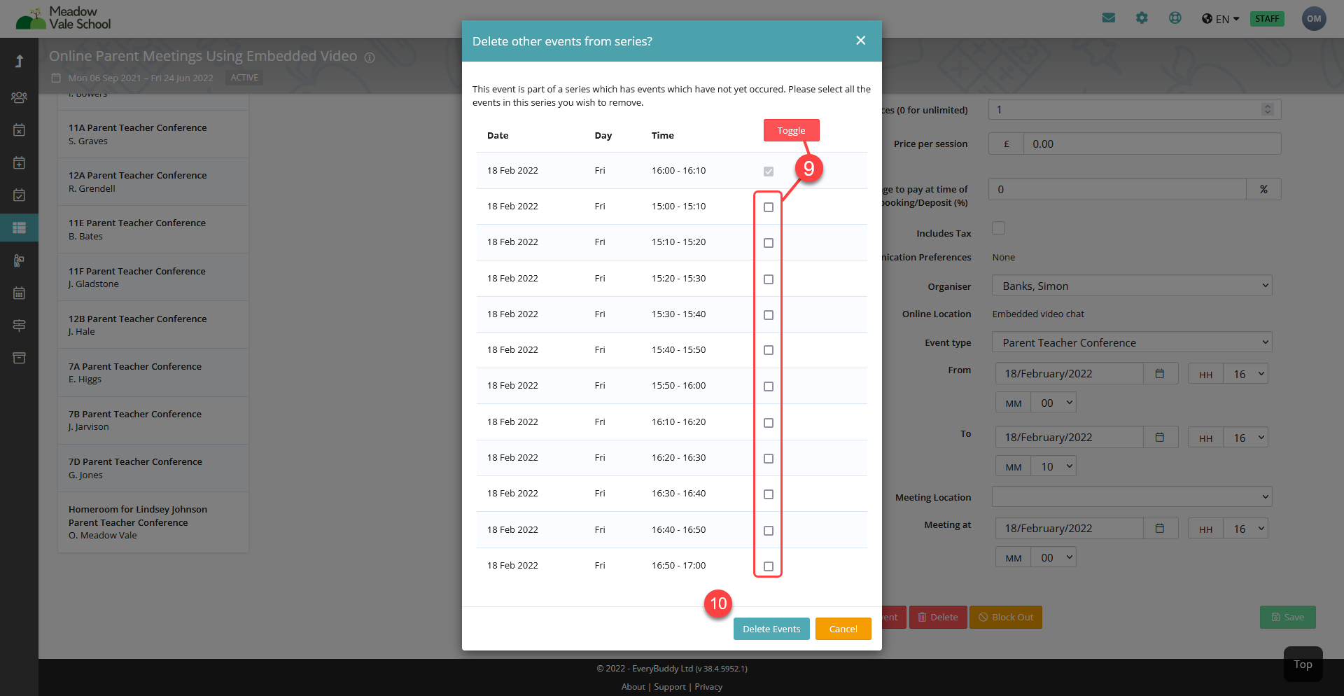 - This will bring up a pop up box asking if you wish to 'Delete other events from series?'. You can 'Toggle All' to change all events or select the events you wish to cancel.