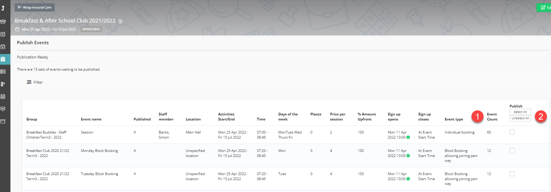 - Lastly, click on on Publish Events to review and confirm everything that has been copied across. You can see the number of events to be published (1). You can choose to publish all the events on the page or only select some to be published (2). Once you have made the selections you are ready to publish.