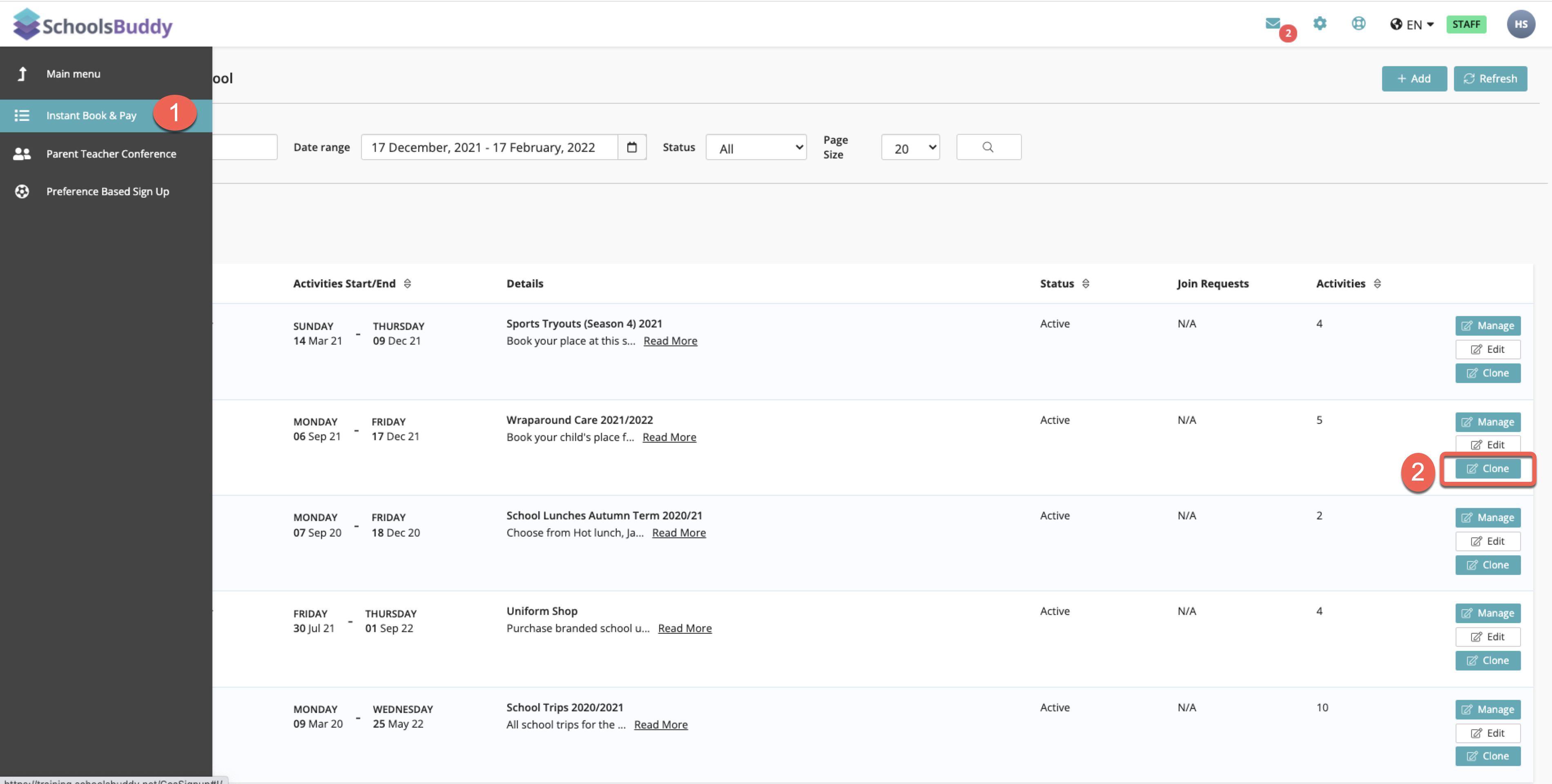 Clone container is a quick way to set up your activities for next term, using the groups and events you created for this term. This can be used for PTC, Wraparound Care, School Trips, Holiday Camps, etc)