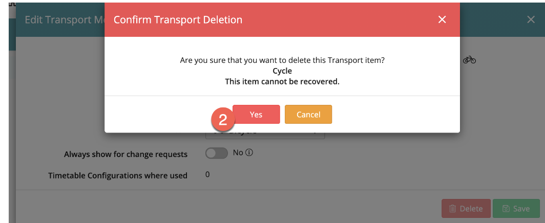 Select delete (1) a further pop-up window confirming you wish to delete your transport method will appear select yes (2). Note once you have selected yes we will not be able to recover.