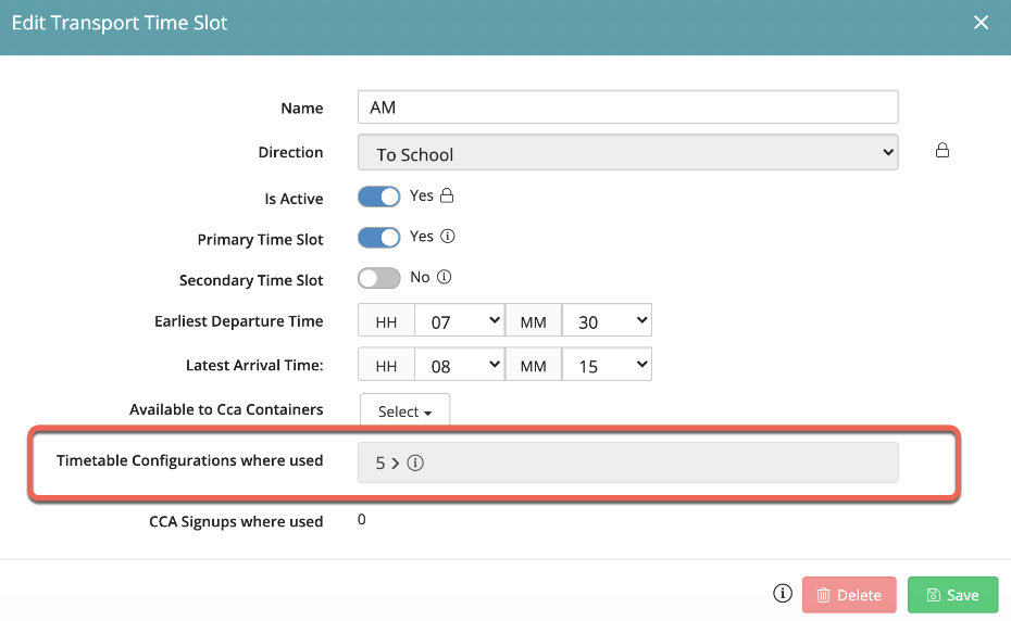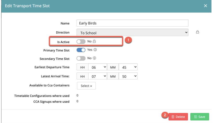You are able to delete transport time slots as long as there are no active timetable configurations or CCA signups linked to the time slots.