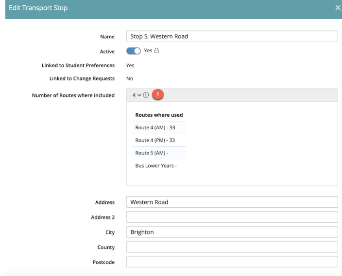 To see what routes the stops are used on select the i icon (1). This will show a drop-down of the routes attached to this stop. Before being able to delete the stop you will need to remove the stop from each of these routes.
