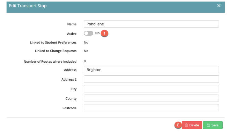 Once the stop has been removed from the routes, you will need to mark the stop as inactive (1) then select delete (2)