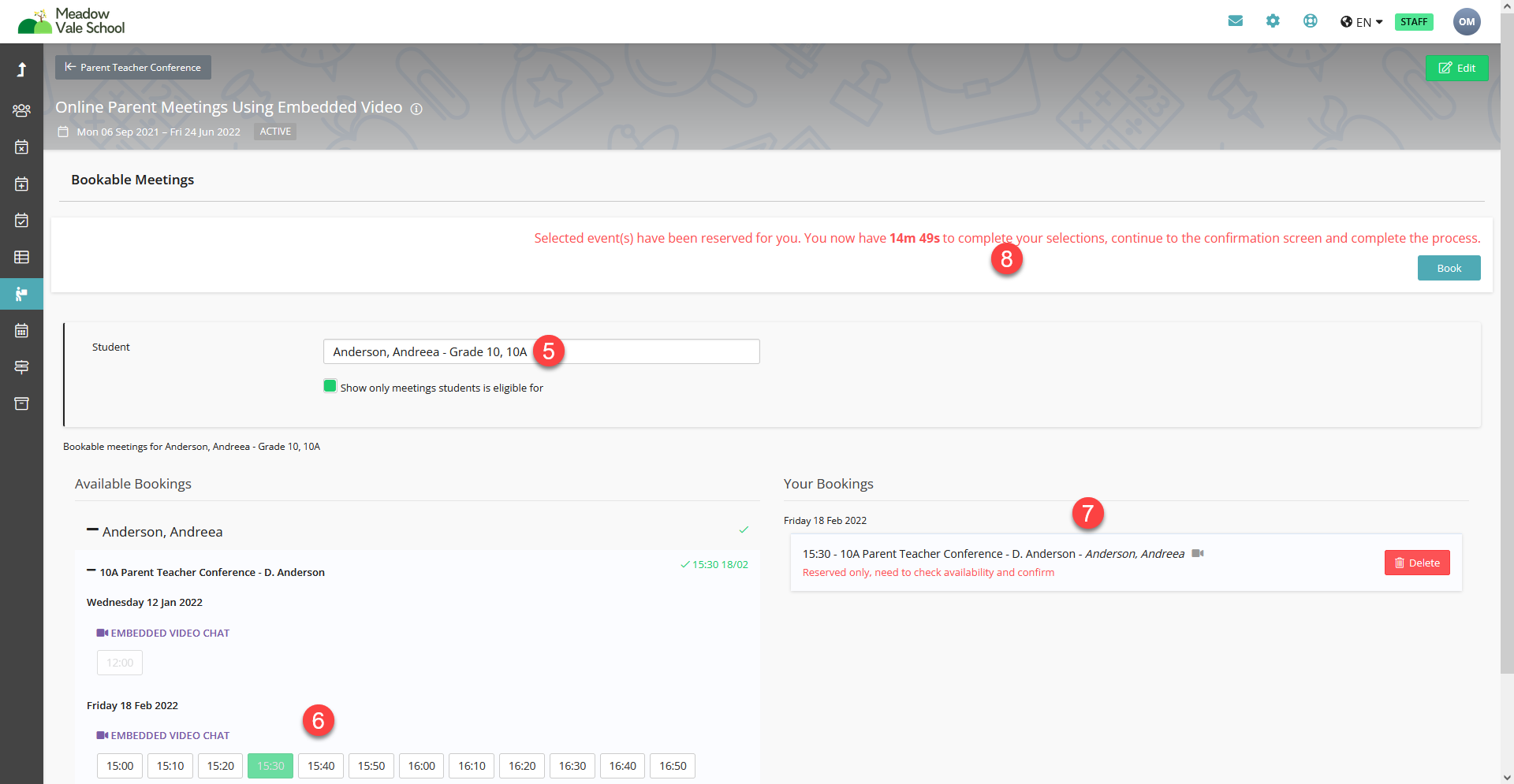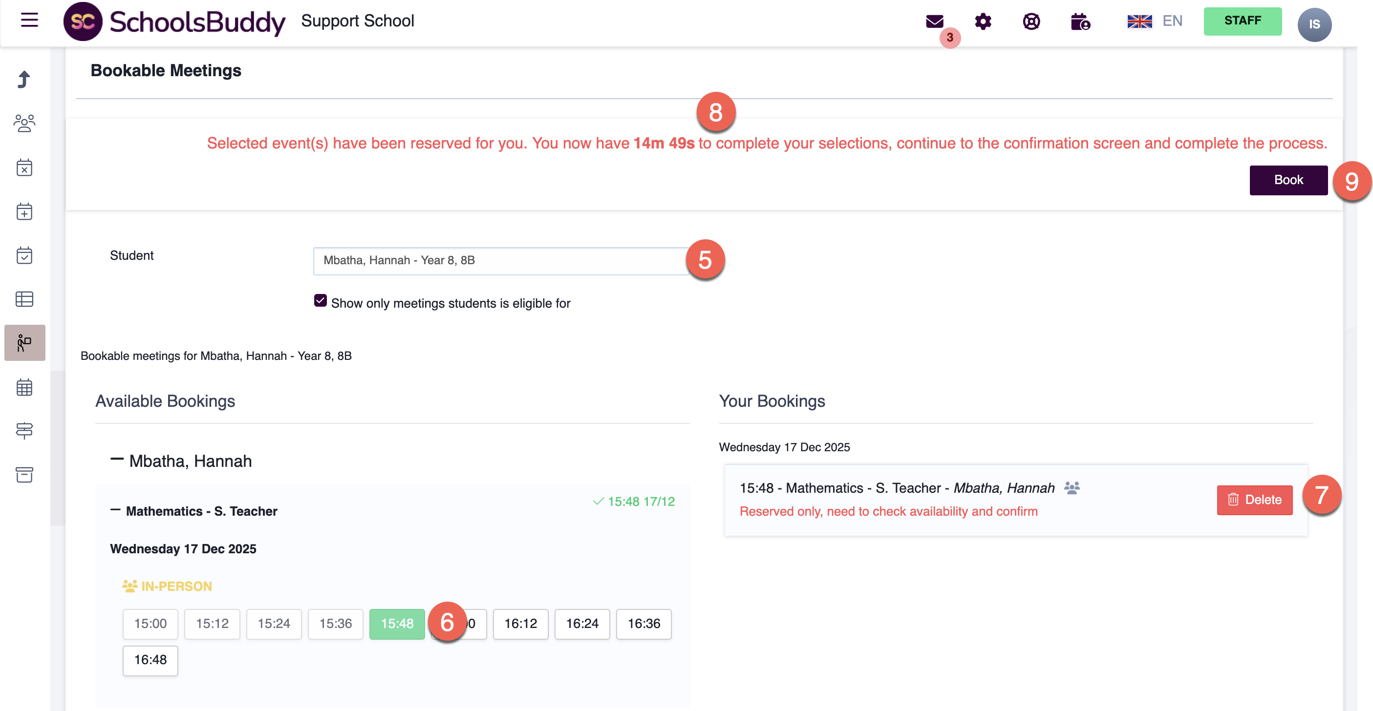 - The bookable time slots for the selected student will be displayed. Select the time slot they have requested