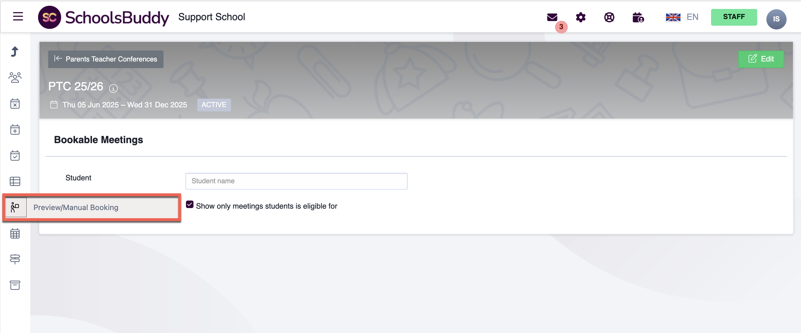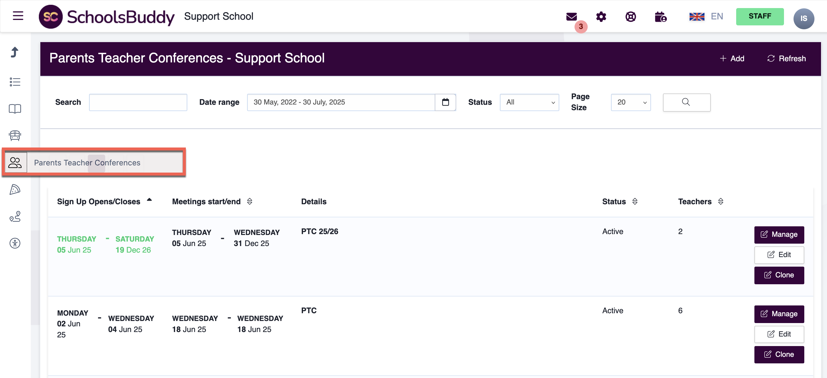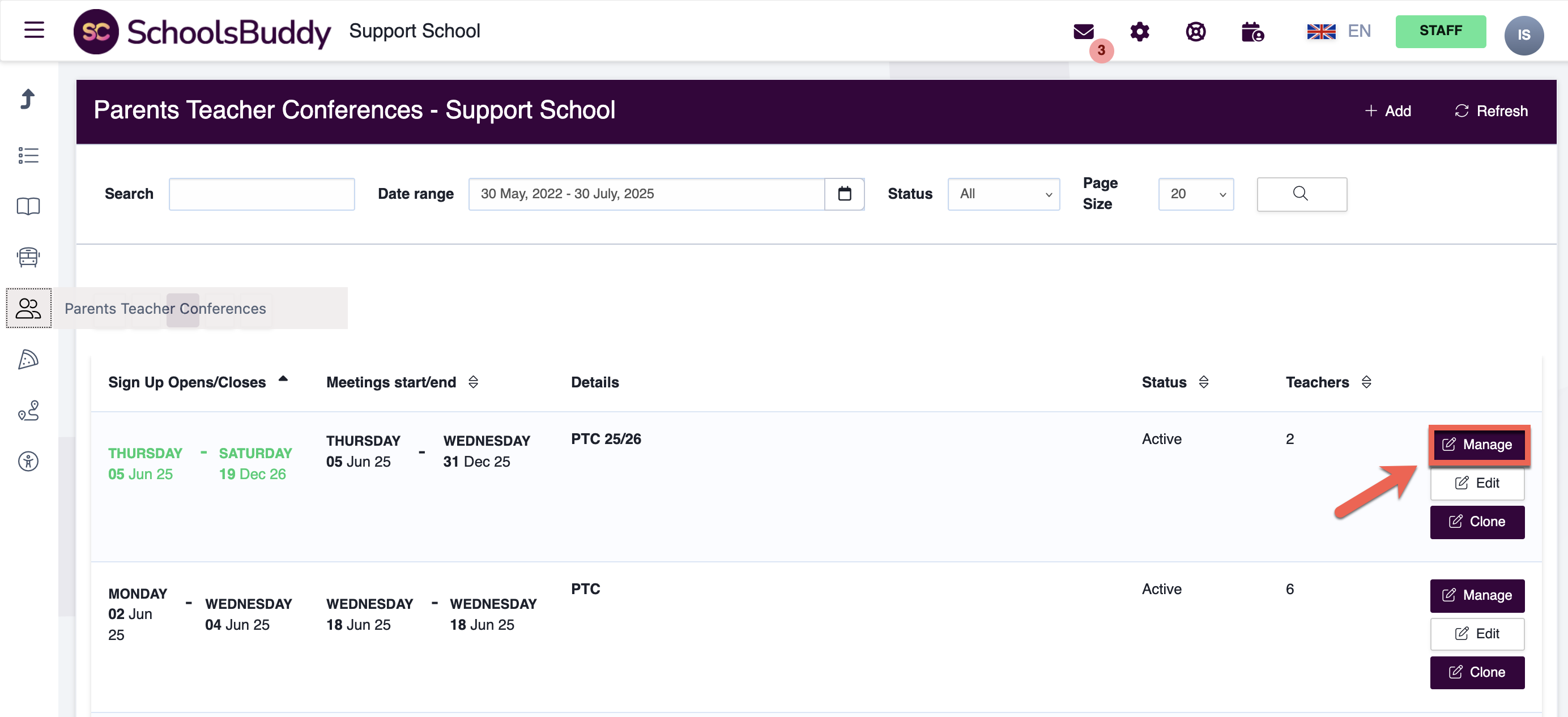 Select the Manage button next to the parents evening/parent conference container you require.