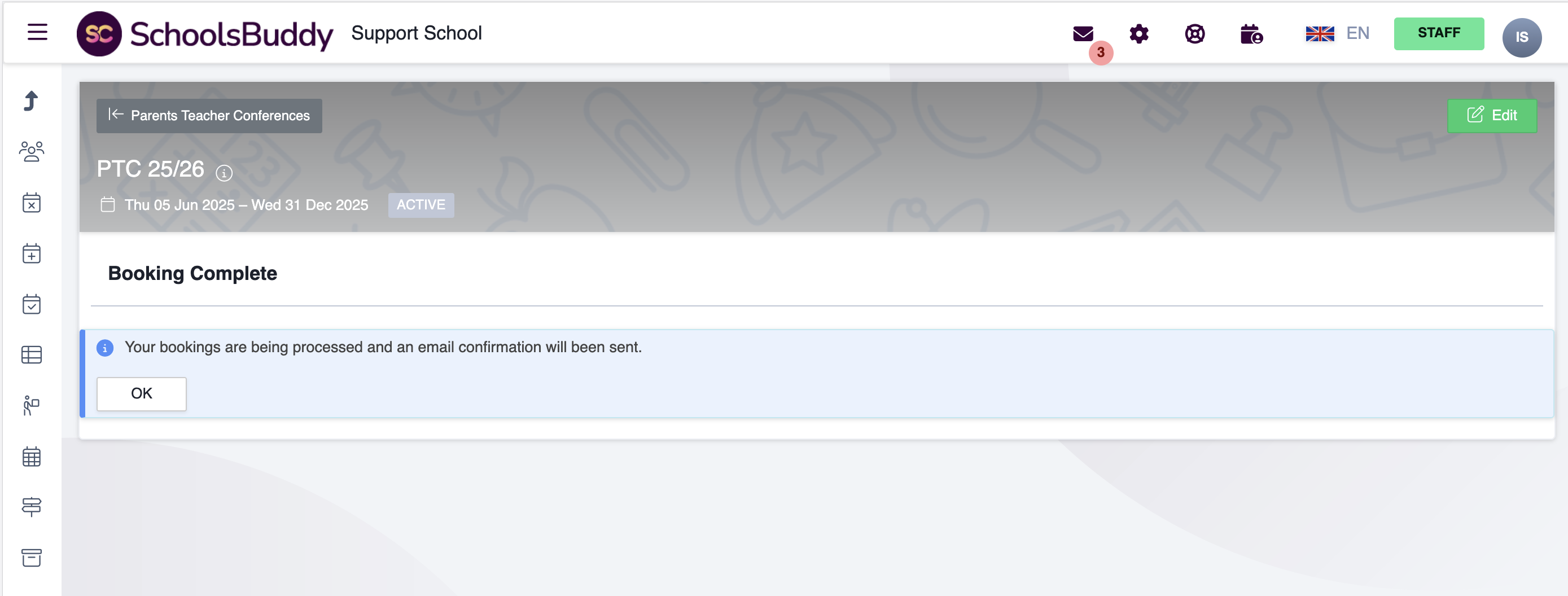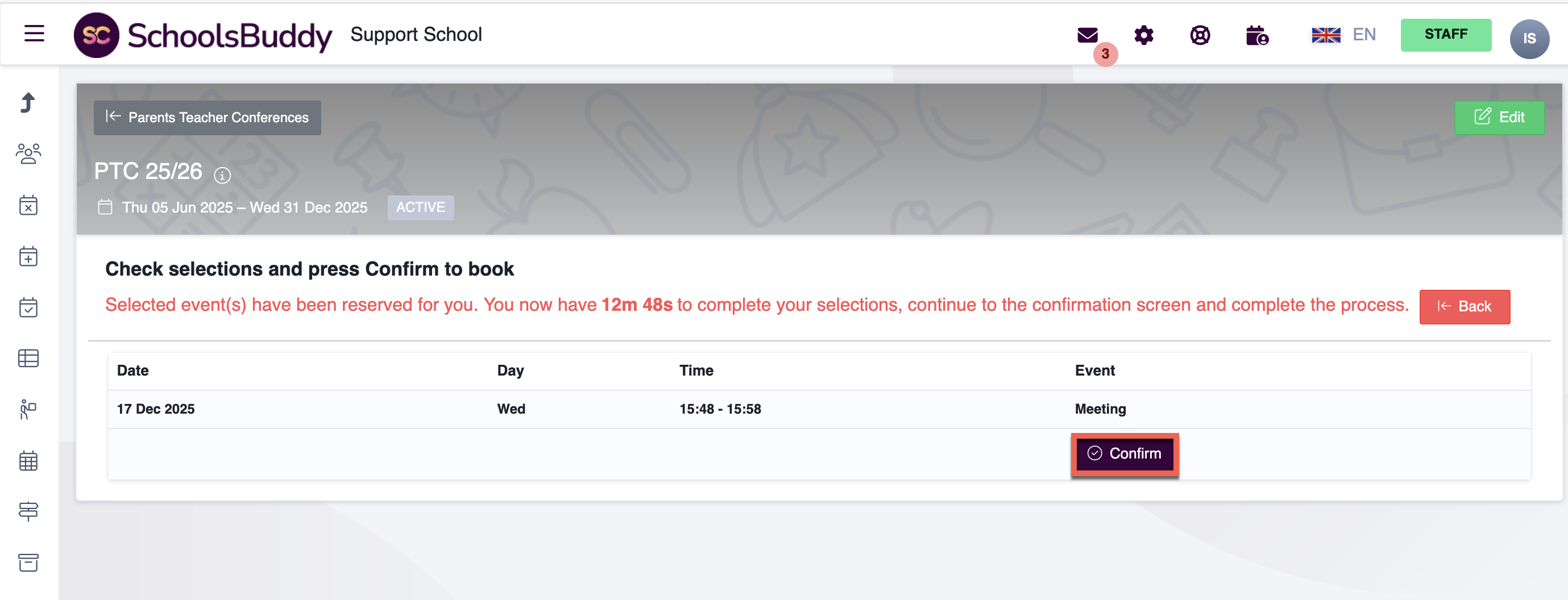 Select Confirm on the summary screen and a booking confirmation message will appear and the parents will receive a booking confirmation email.