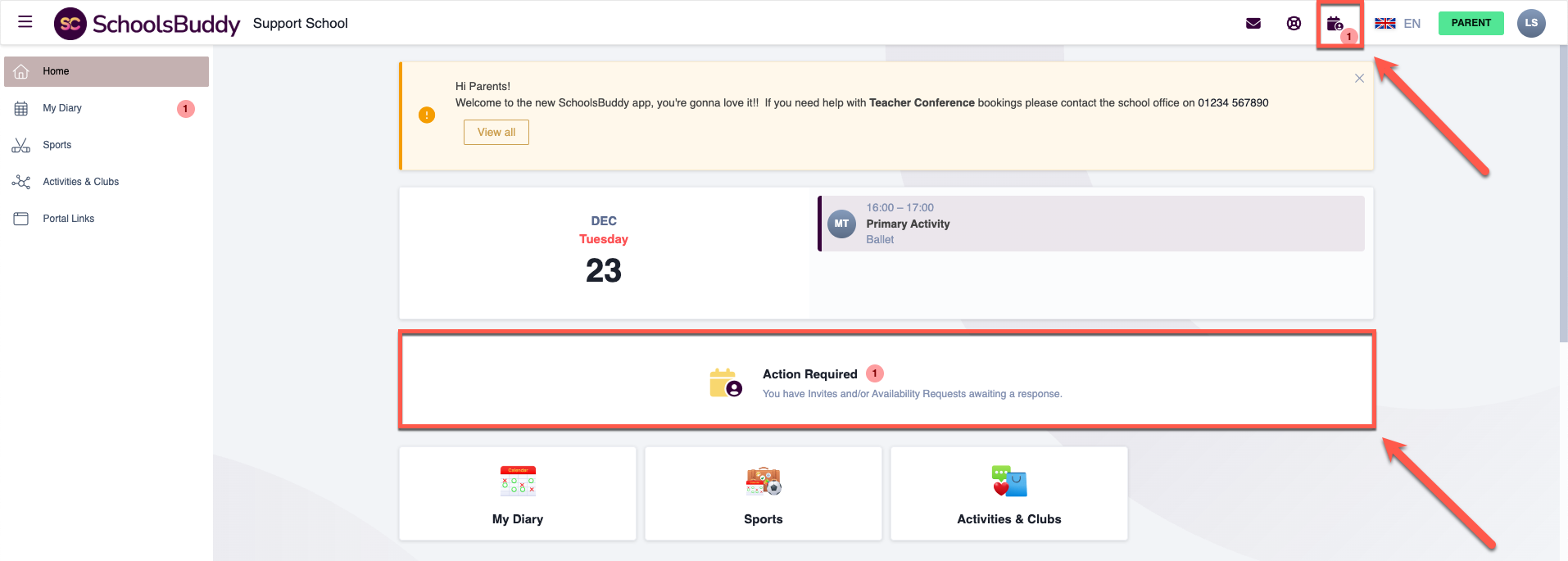 After logging in, parents can access the request in either of the following ways: