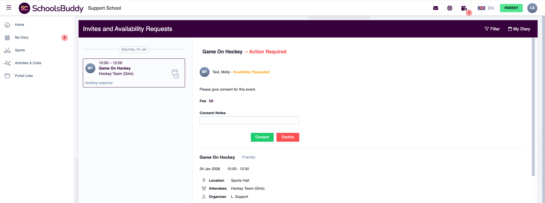 When you create an event (such as a Trip or Sports event) that requires parent consent or availability, parents will receive an email notification asking them to log in to SchoolsBuddy.