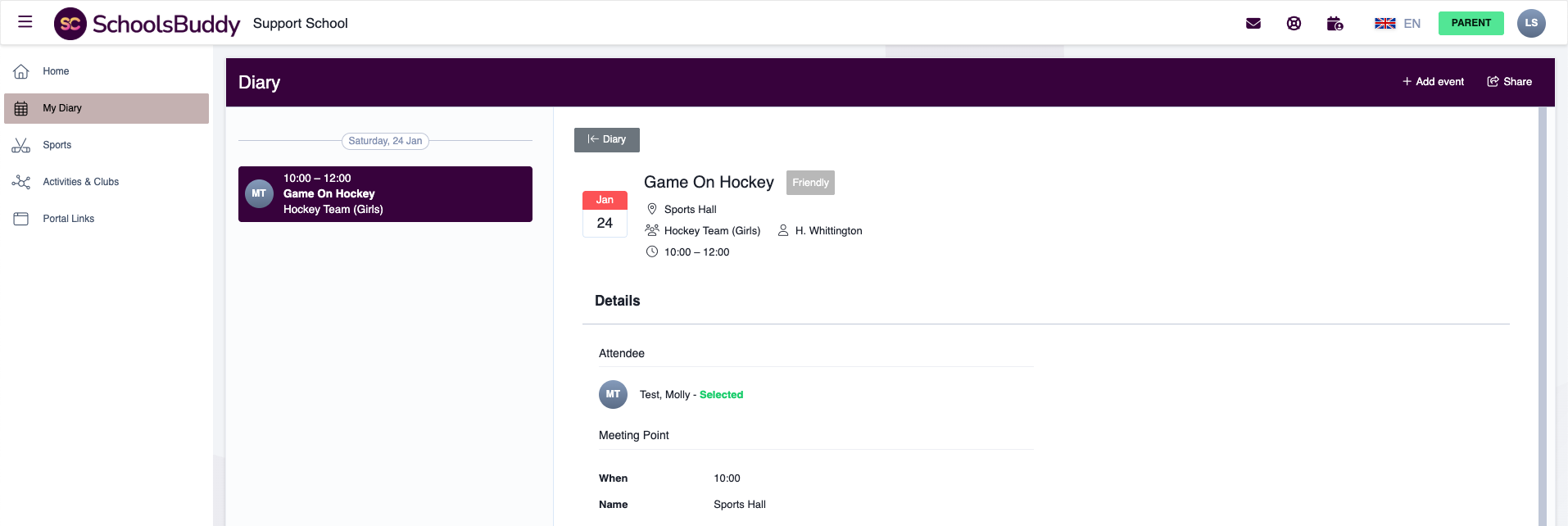If the organiser has enabled automatic selection after consent, the event will be added to the student’s school diary immediately once consent is given.