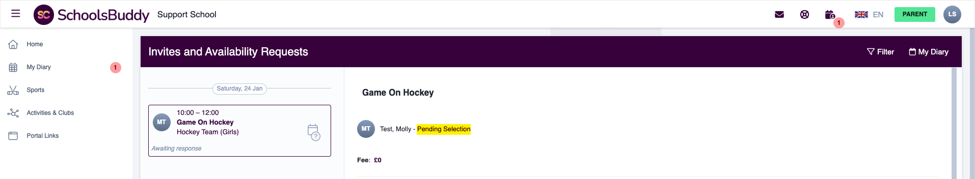 If the organiser has chosen to collect consent first and confirm selections later, the event will appear in the parent’s calendar as Pending selection until the organiser finalises participation.