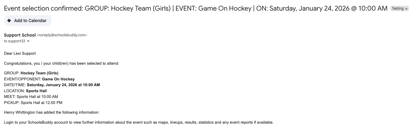 Once the student is confirmed for the event (either automatically or manually by the organiser), the parent will receive a confirmation email with the event details.