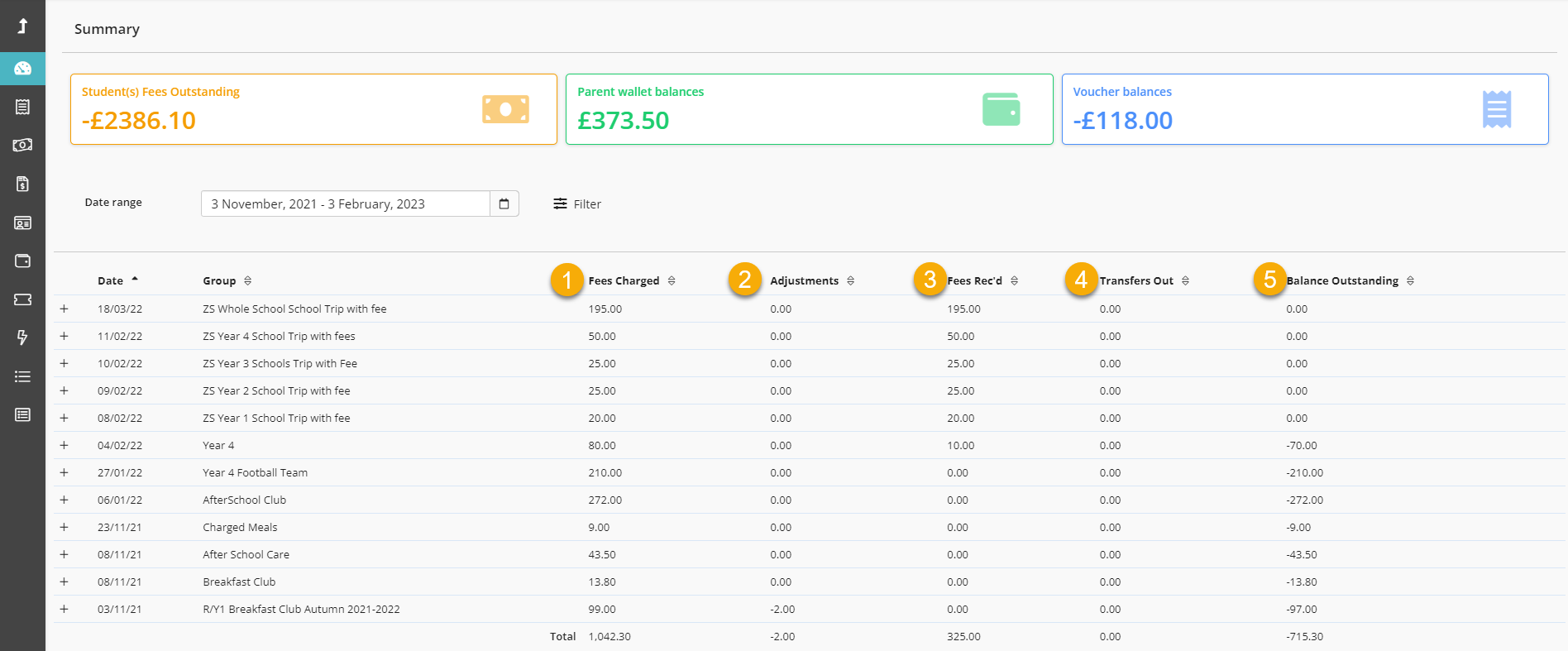 Apart from the Date (this shows the date of the Transaction, not the date of the event) and Group columns, the summary screen has 5 columns. These are specific to how schools work with multiple charges, corrections, discounts and payments, refunds and more which are all supported.