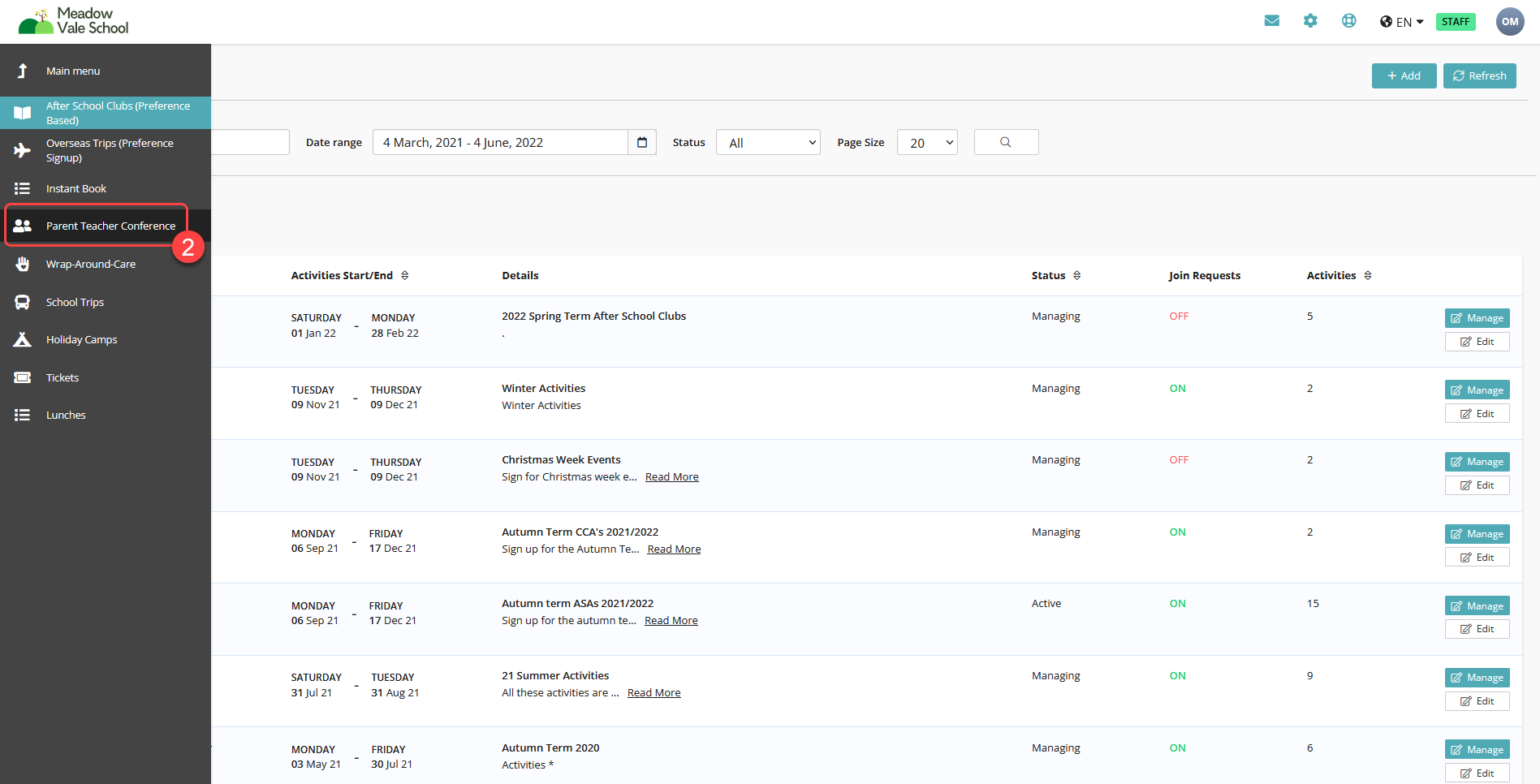 Click the Activities & Clubs / Bookings Admin tab (this may be labelled differently due to your School's preferences)