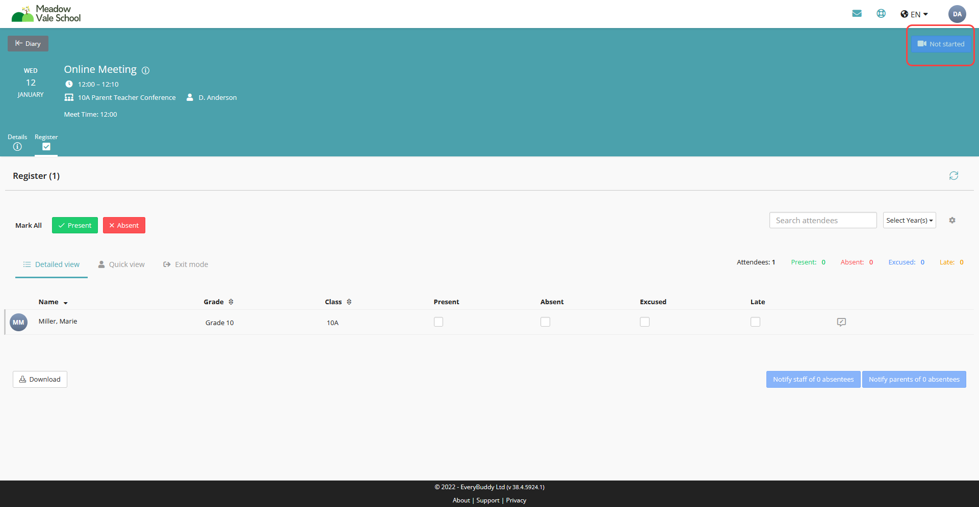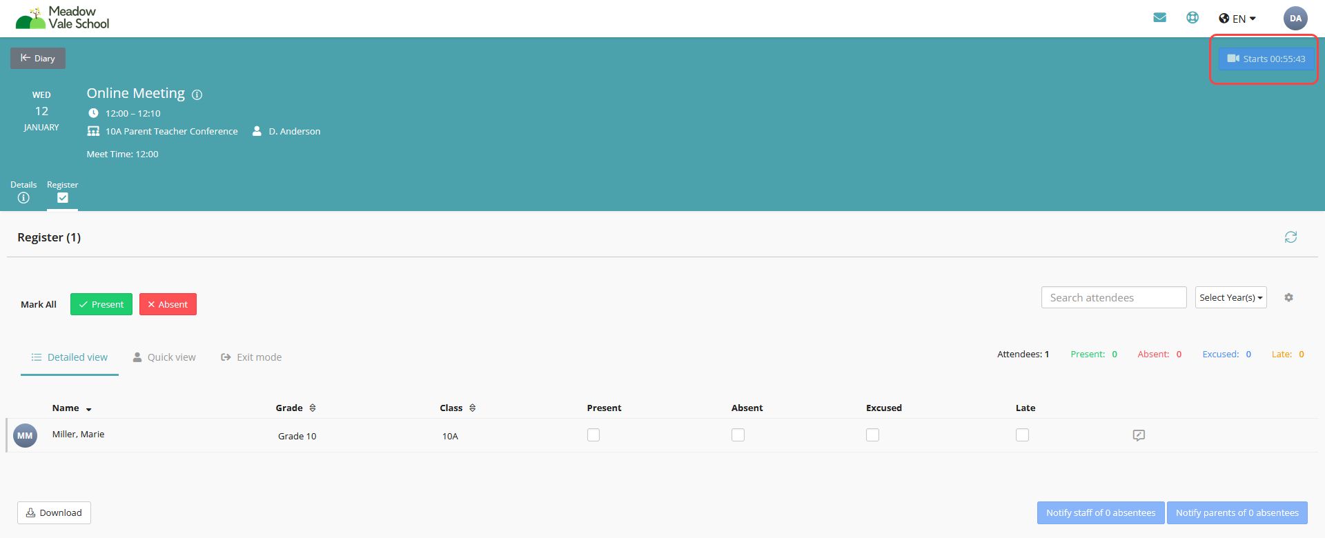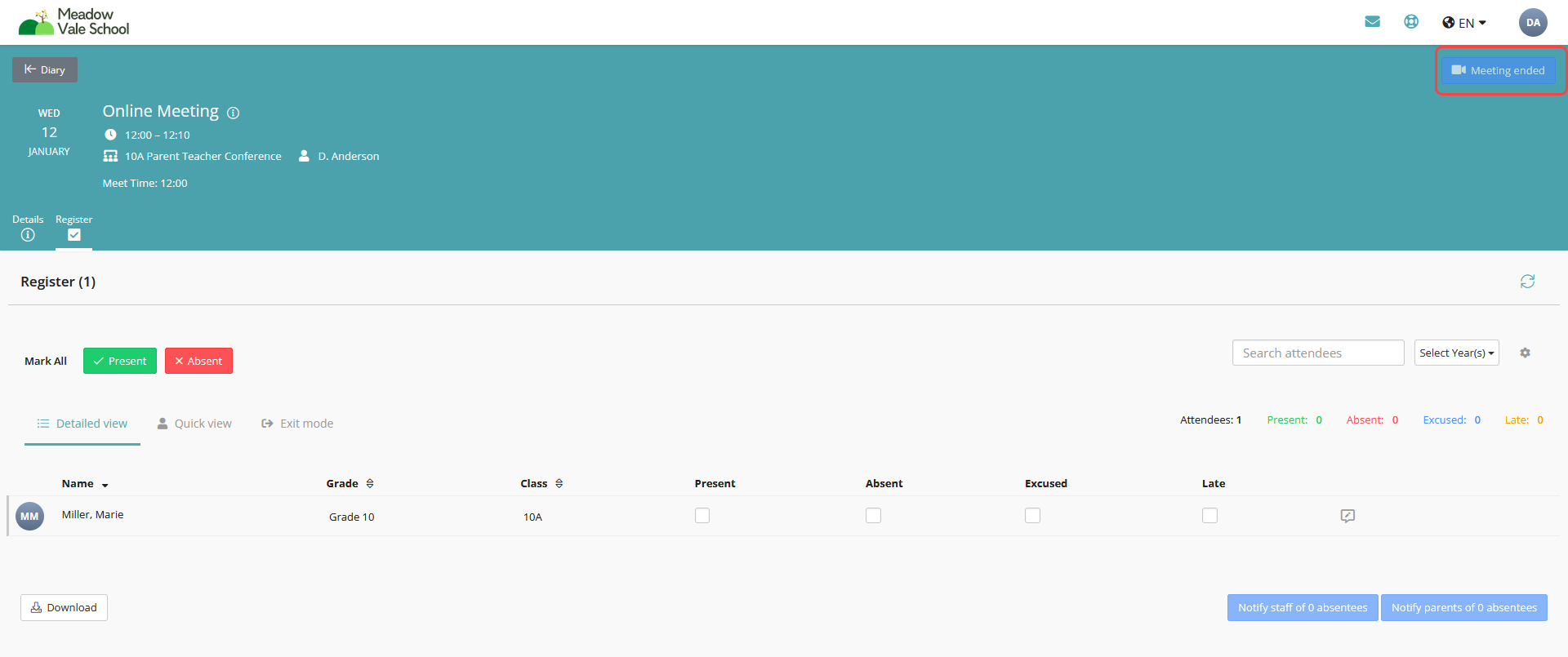 Once the timer counts down to zero, or the meeting is ended by the member of staff, then the screen will go back to the event, the button will change to Meeting ended and the member of staff can then take the register.