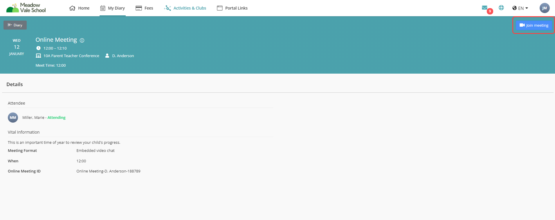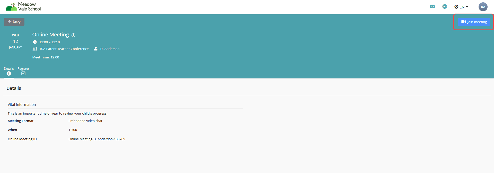 Please note you can only successfully join a meeting from the SchoolsBuddy interface. If the users has set up the link to another diary option such as Outlook or Google, they will need to log in to SchoolsBuddy to join the meetings.