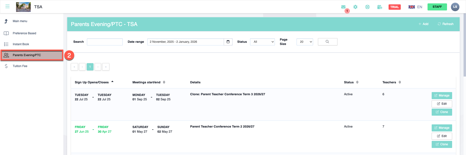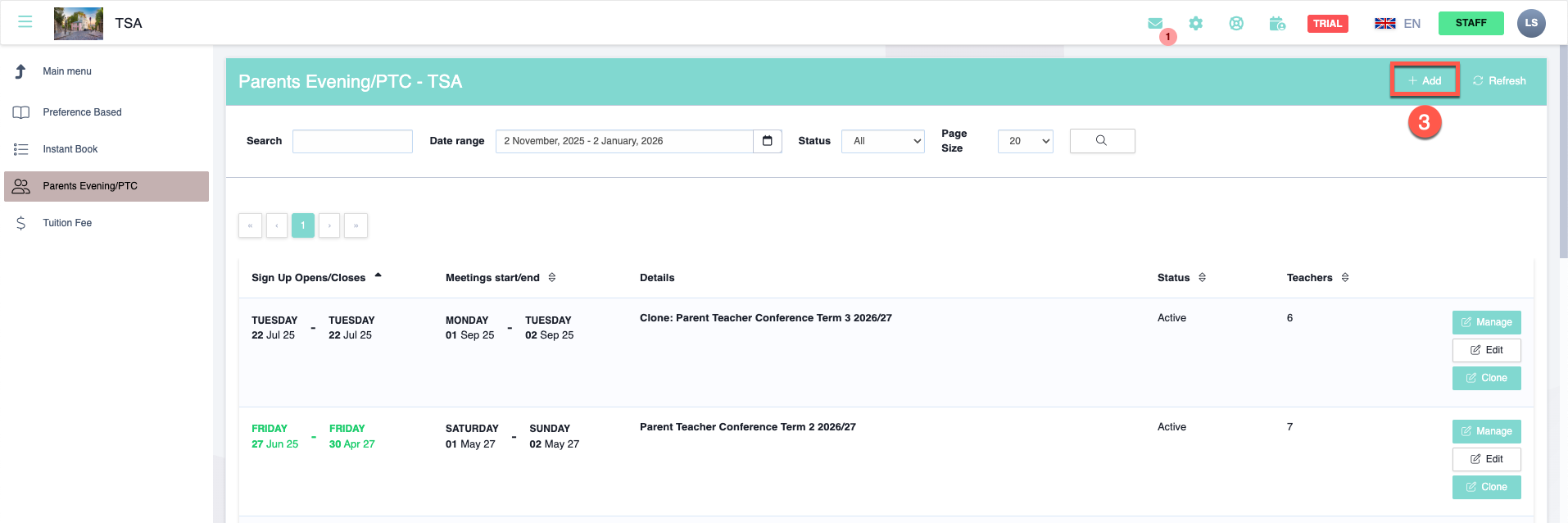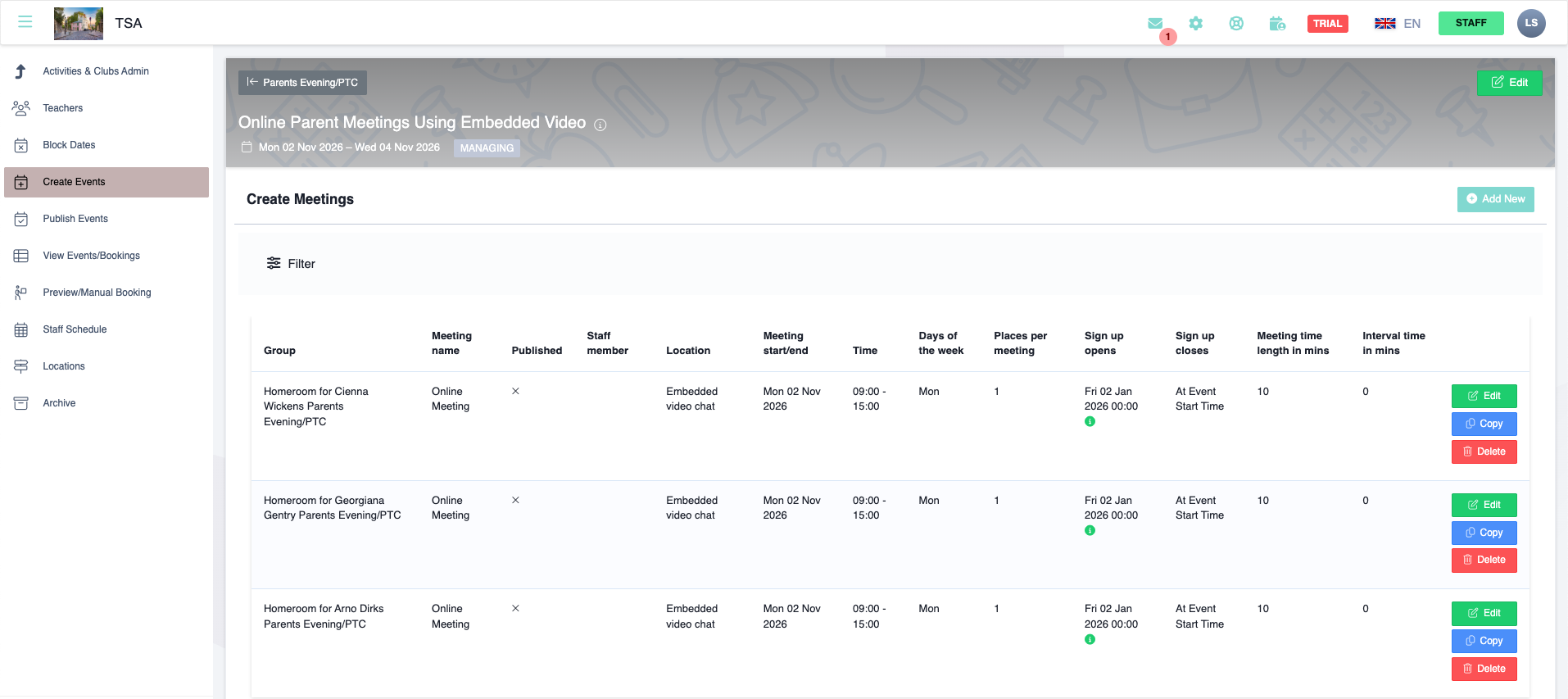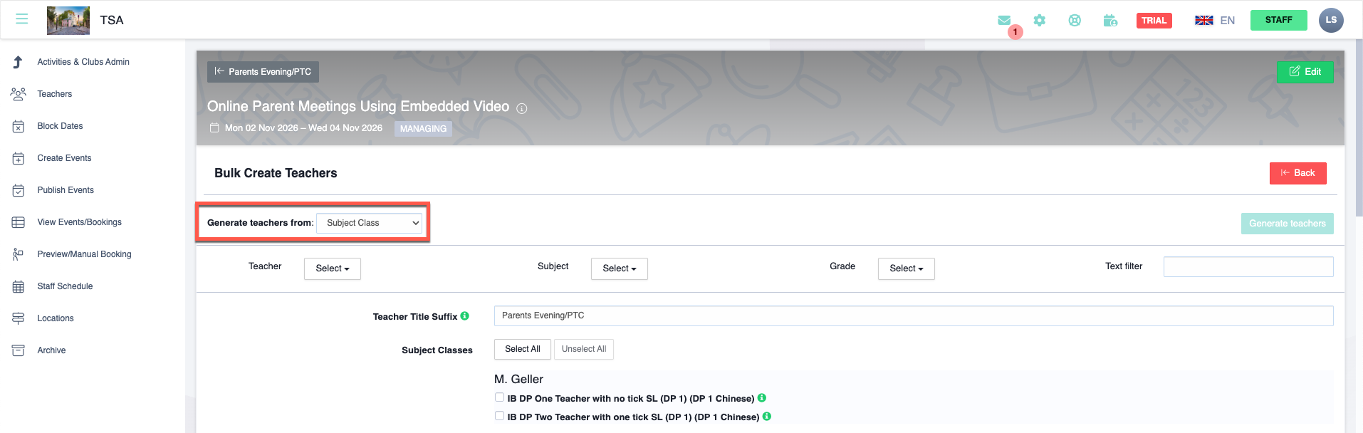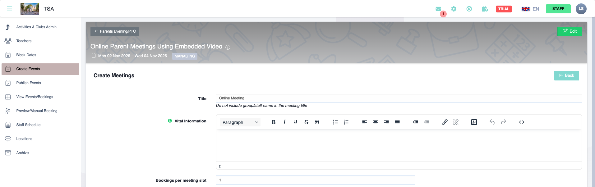 - Meeting date: select the day/s for the Parents' Evening / Parent Conference.