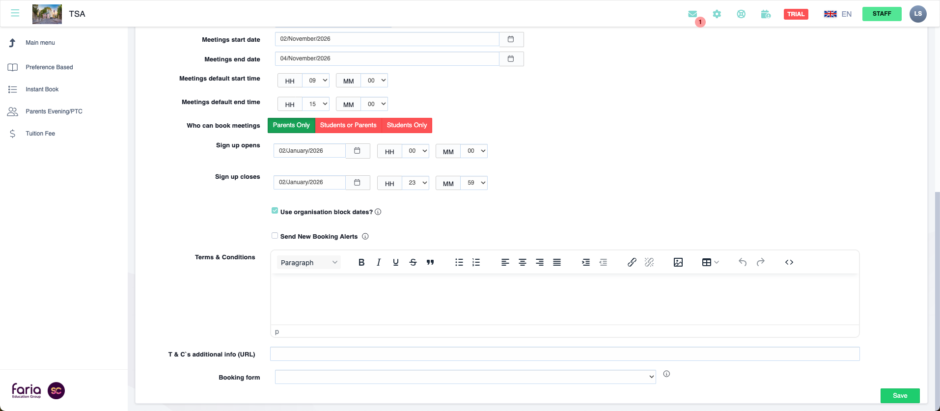 - Meetings start date: Date conferences will run from. You can enter dates for the whole year if you want to give a general guide to parents.