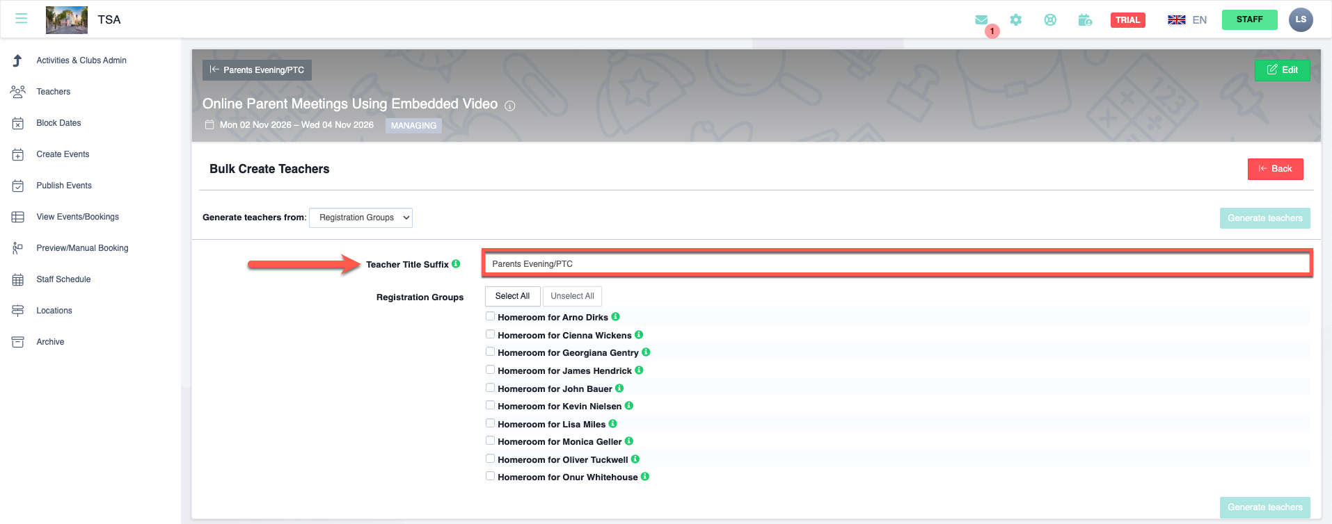 Choose a Teacher title suffix. For example, if you select Registration Groups, the group title suffix will be applied e.g. 10A Parent Teacher Conference, 10B Parent Teacher Conference. This is what a parent will see when they choose the teachers they want to book.