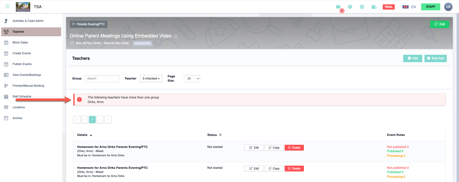 If you see a warning message indicating that more than one group is linked to the same teacher, please take extra care when scheduling meetings. Make sure meetings for these groups are not scheduled at the same time, as this would result in overlapping bookings.