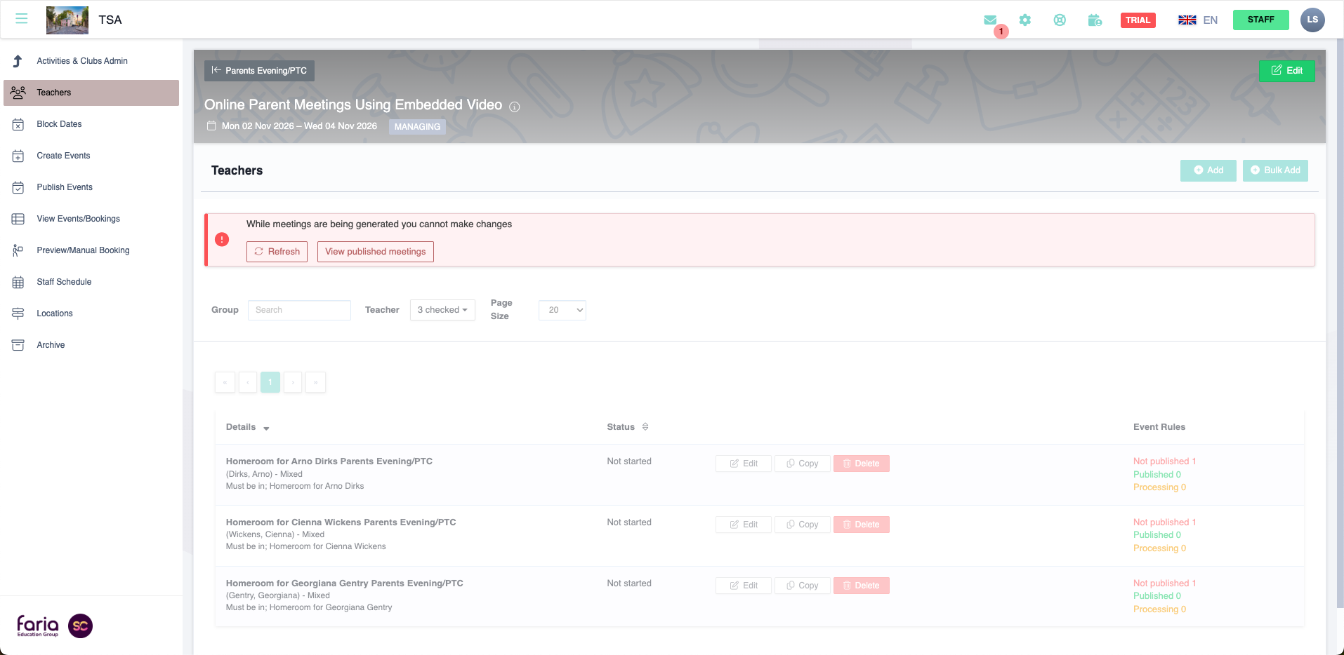 23. A message will appear saying that the meetings are being generated and cannot be changed during processing. Once they have been generated, this message will automatically disappear, or you can click Refresh to update the screen.