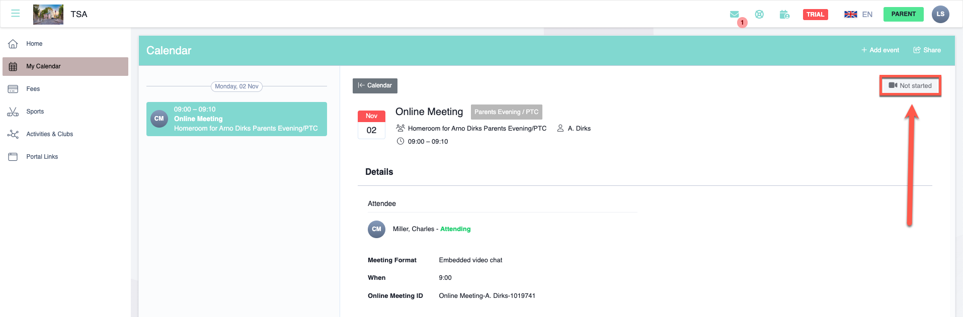 Once a parent has completed a booking and it is in the diary of the parent and member of staff, when they click on it, there will be an icon showing that the meeting has Not started.